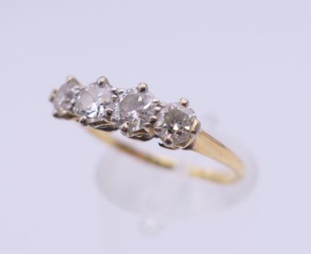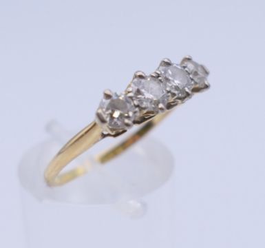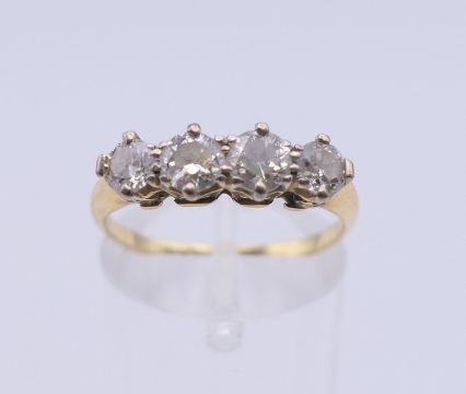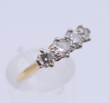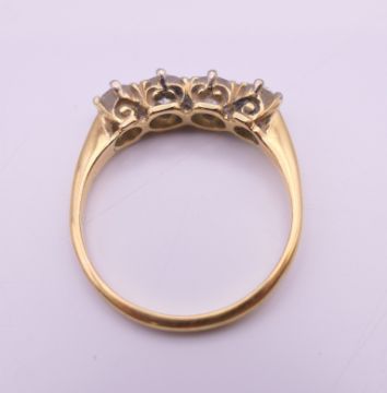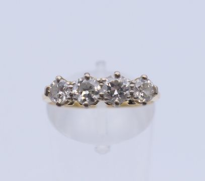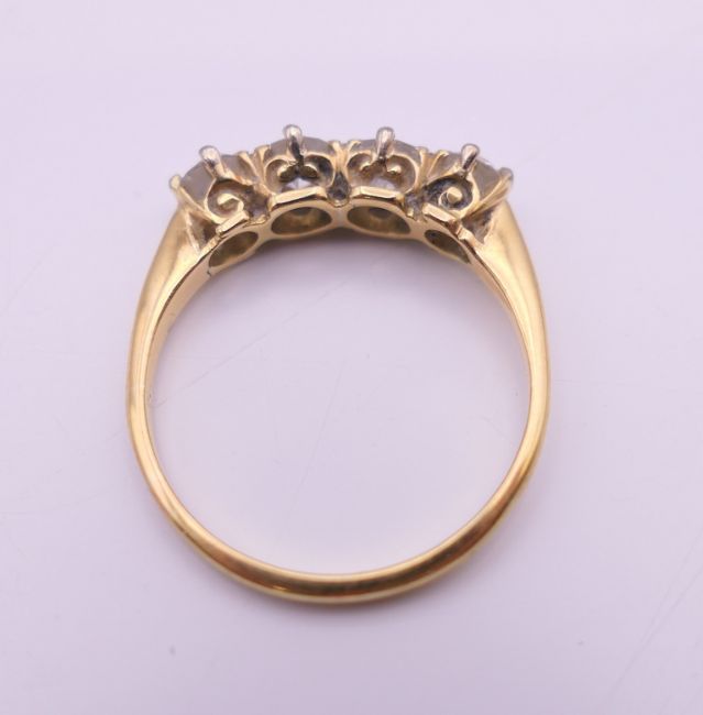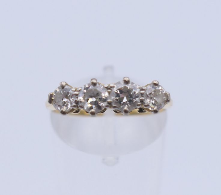 An unmarked gold four stone diamond ring. Ring size O. 2.7 grammes total weight.