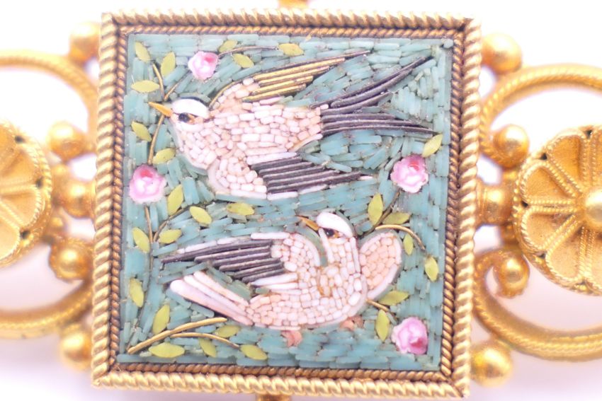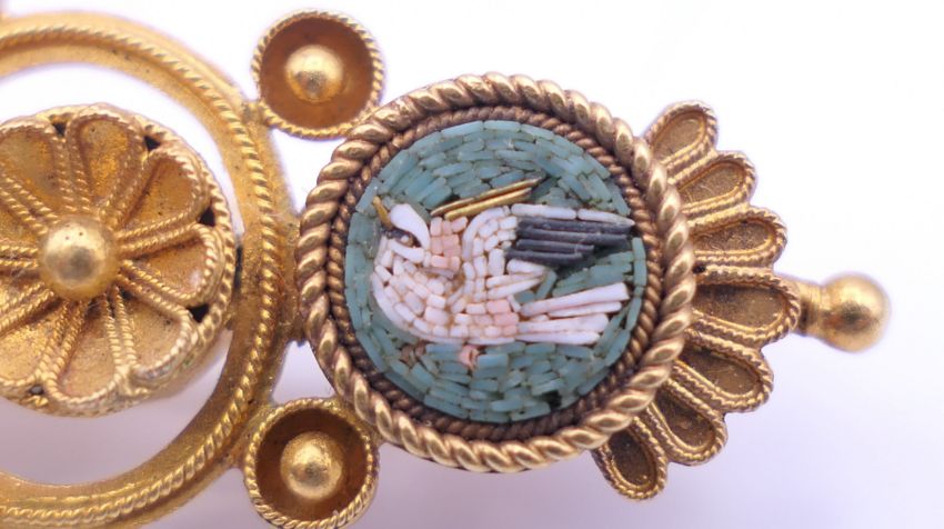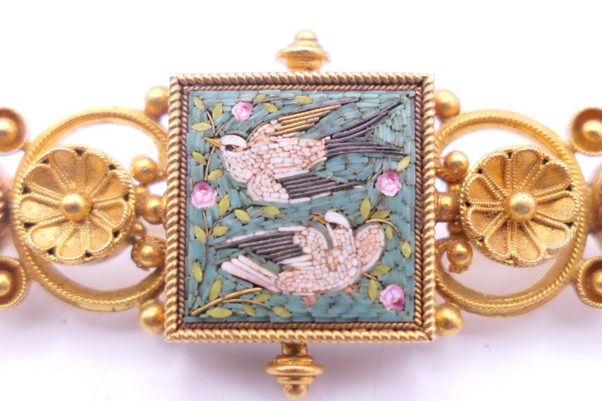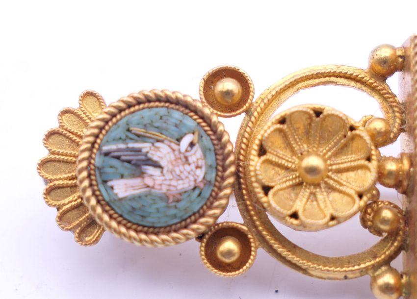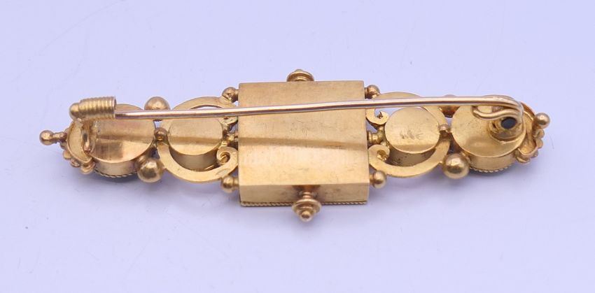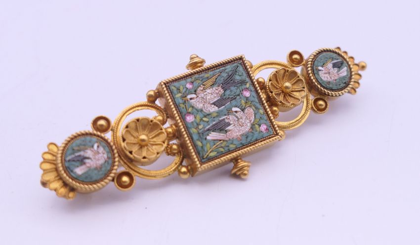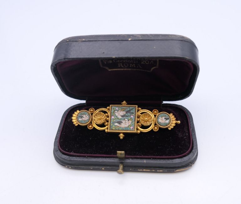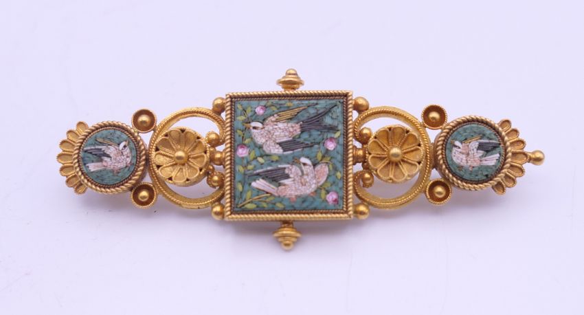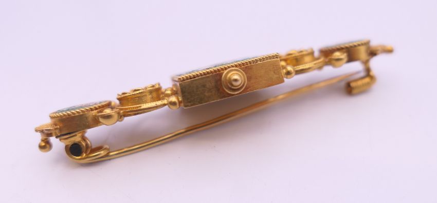 A Victorian unmarked gold pietra dura brooch, boxed. 6 cm long. 10.7 grammes total weight.