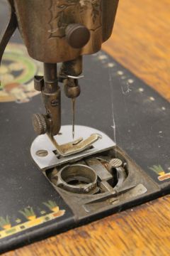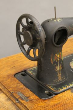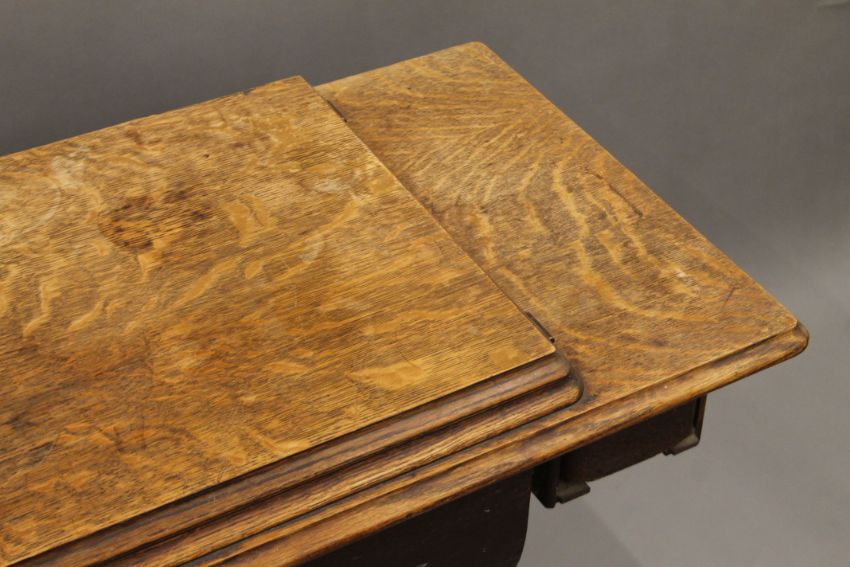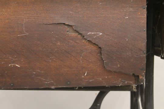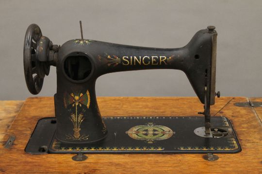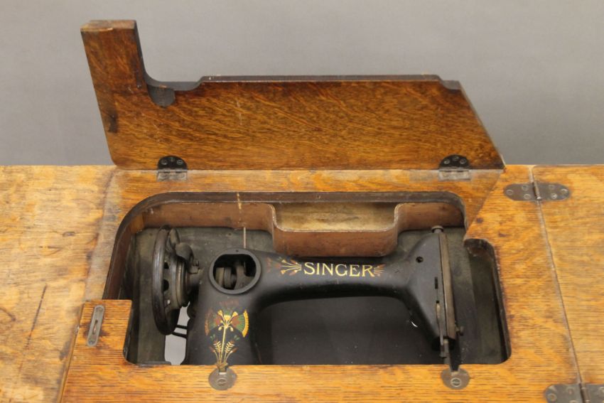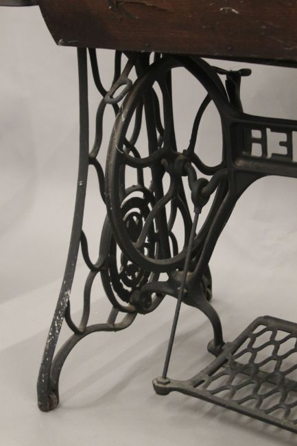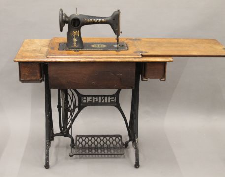 A Singer sewing machine on original treadle base. 91.5 cm long.