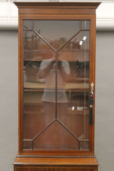 A 19th century inlaid mahogany glazed side cabinet. 58 cm wide x 197 cm high.
