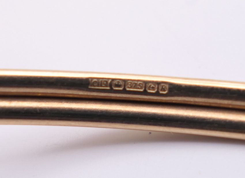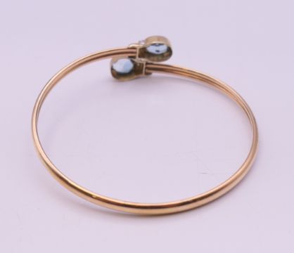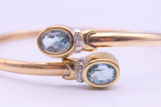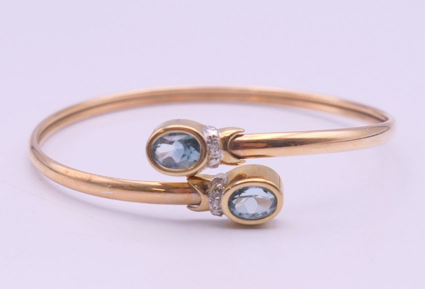 A 9 ct gold diamond and aquamarine set bangle. 6 cm wide. 7.4 grammes total weight. .