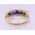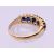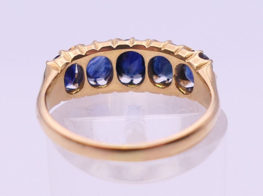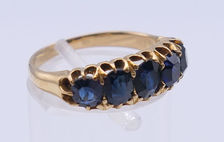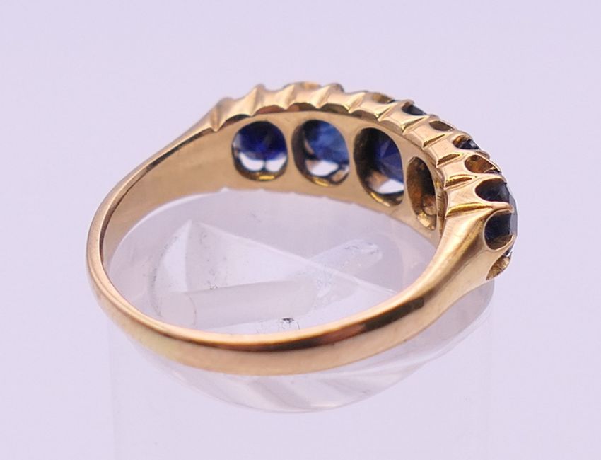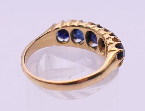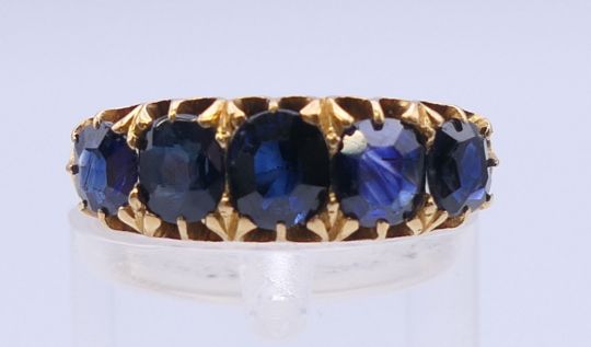 A 19th century unmarked gold five stone sapphire ring. Approximate sapphire weight 5.5 carats. Ring size L/M.