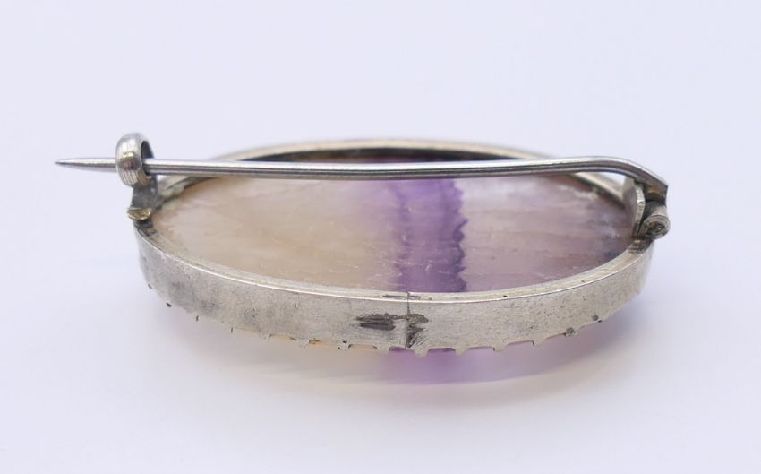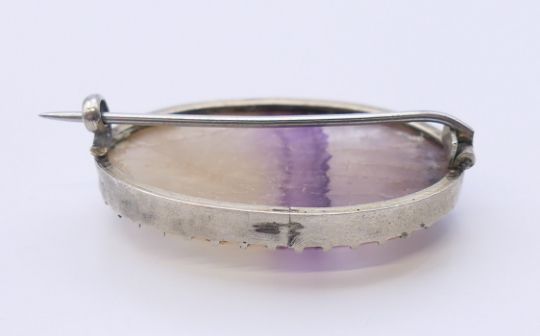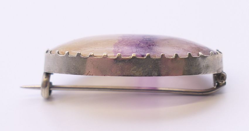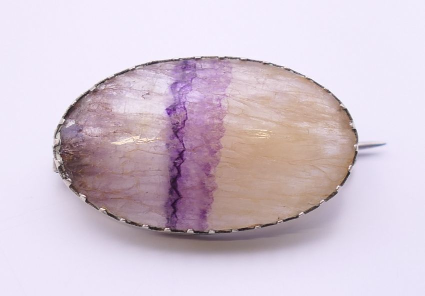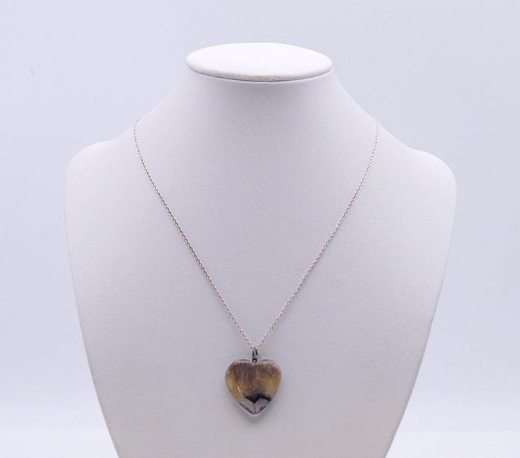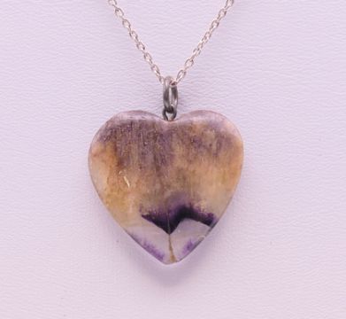 A blue john brooch and a blue john heart form pendant. The former 3 cm wide.
