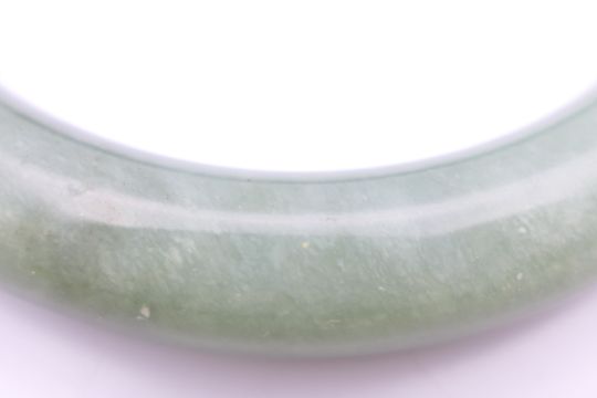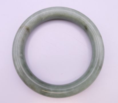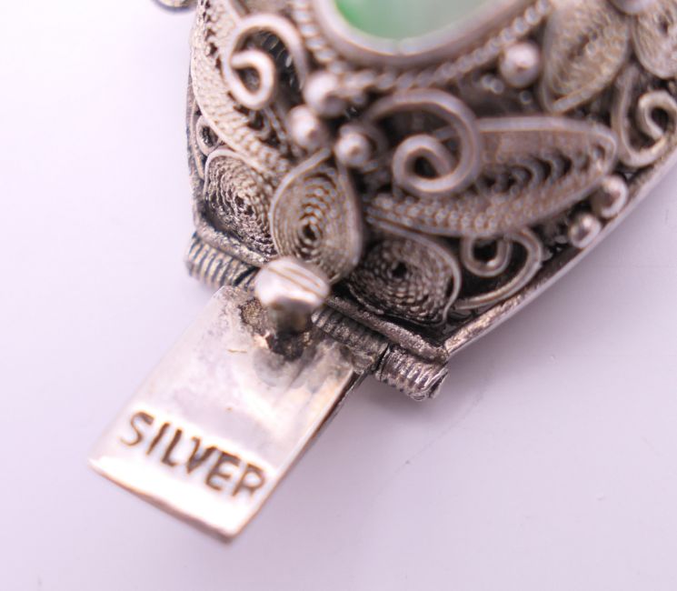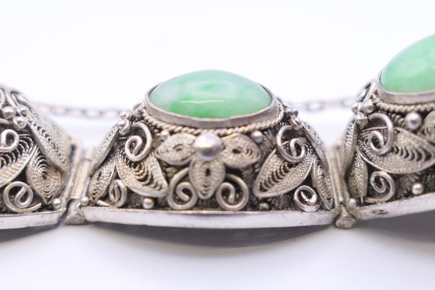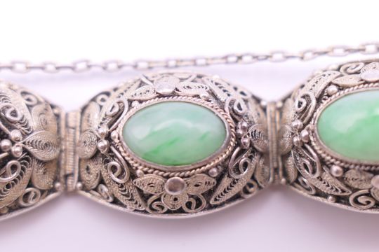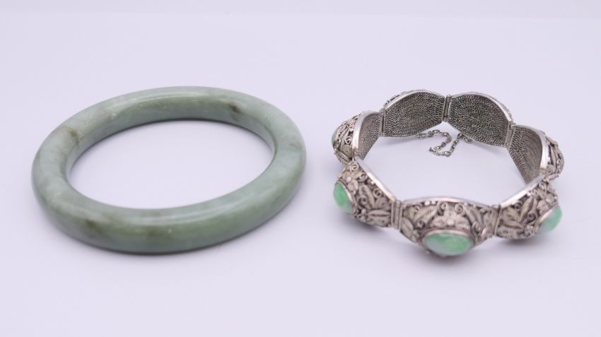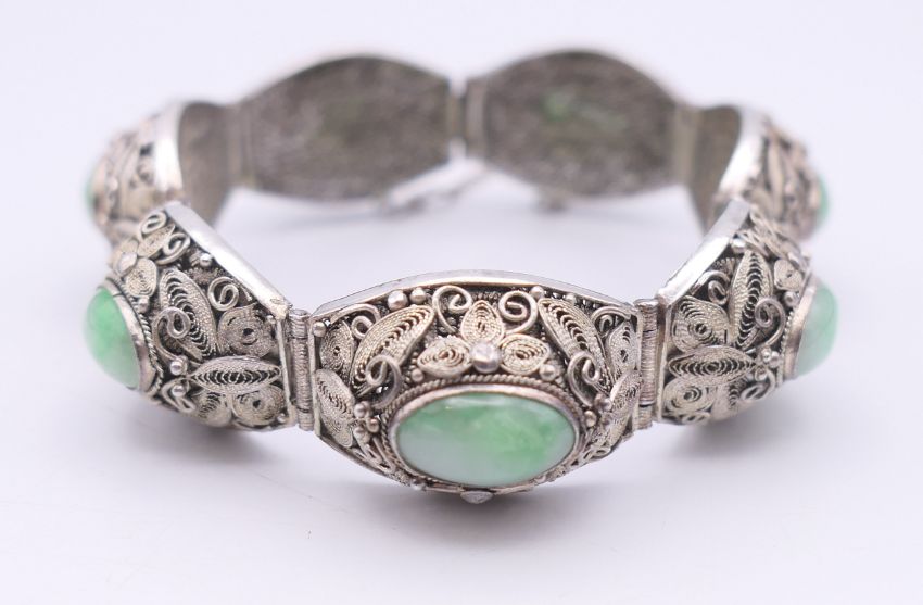 A Chinese silver and jade bracelet, and a bangle. The former approximately 17 cm long.
