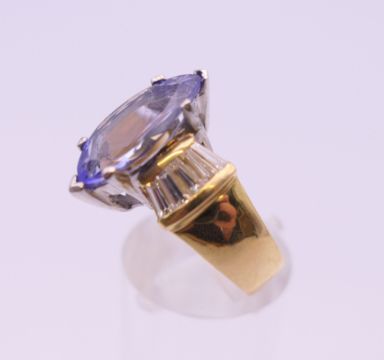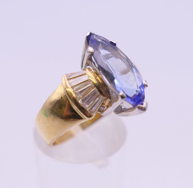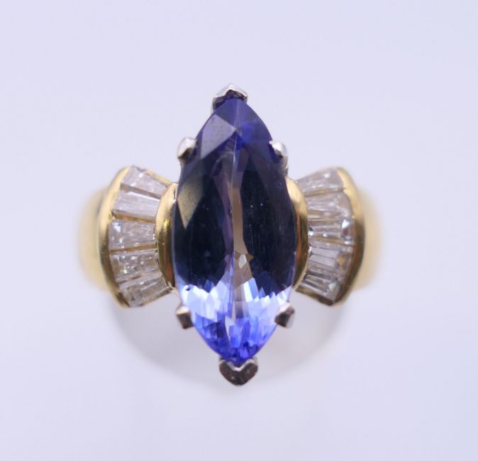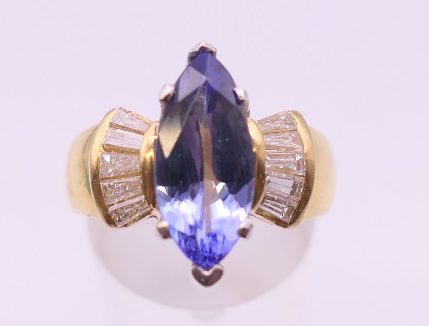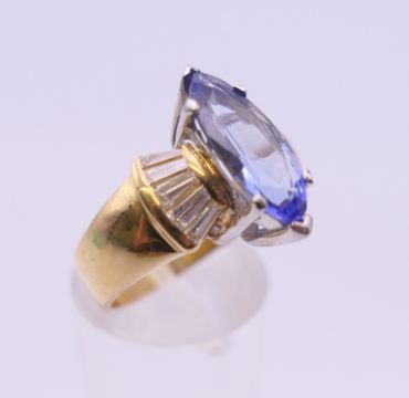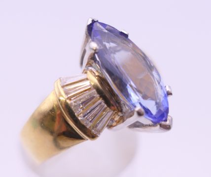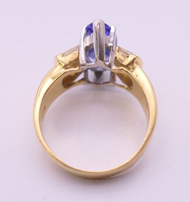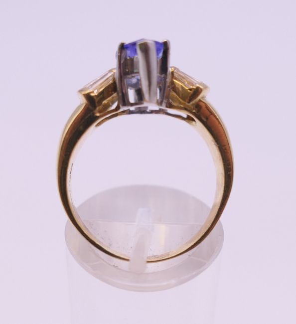 An 18 ct gold tanzanite and baguette diamond ring. Ring size O/P.