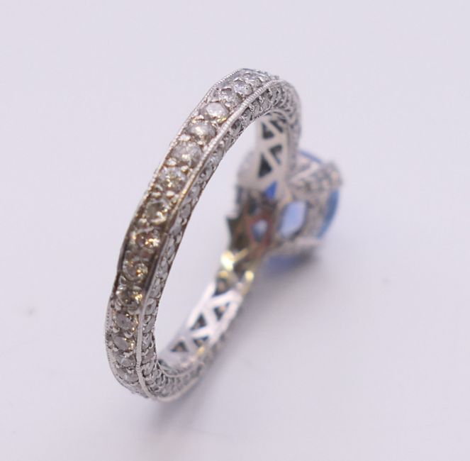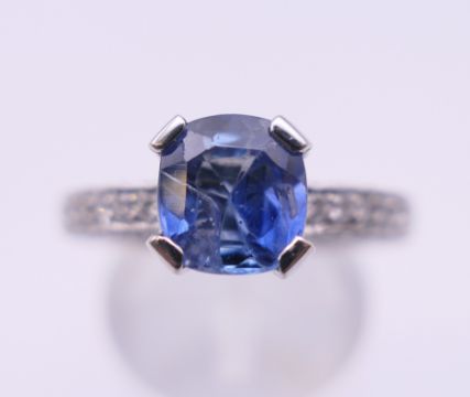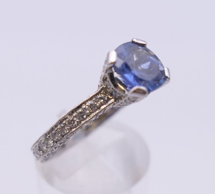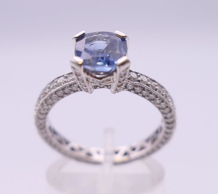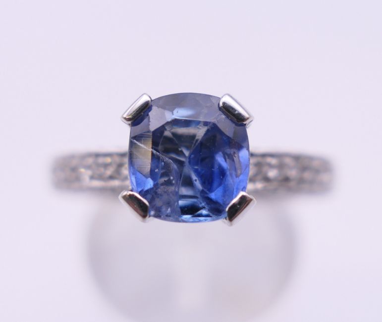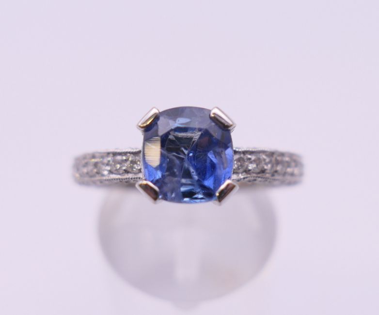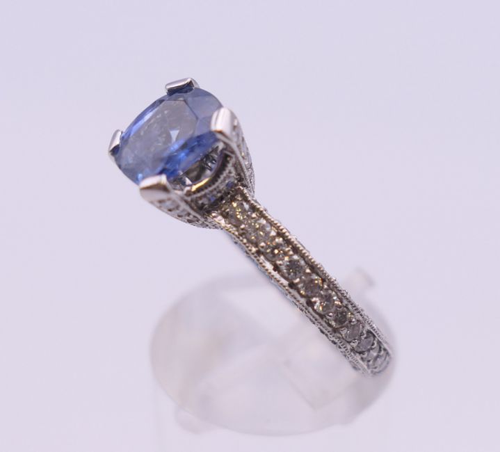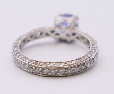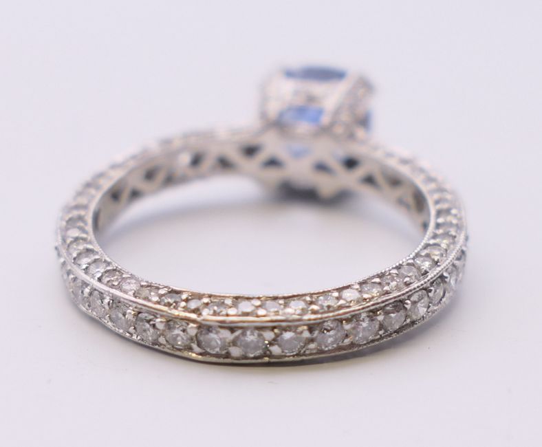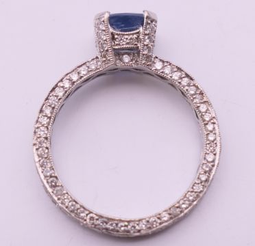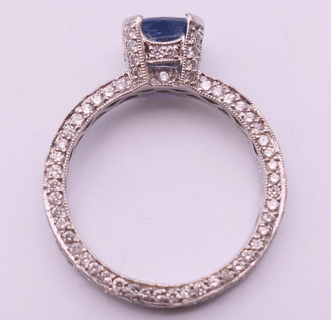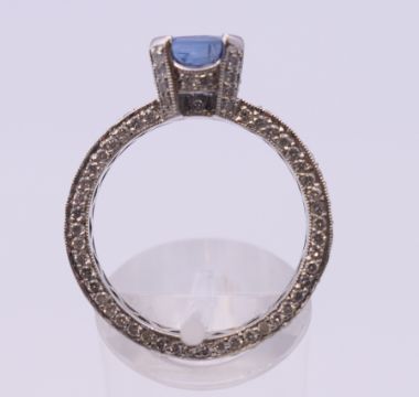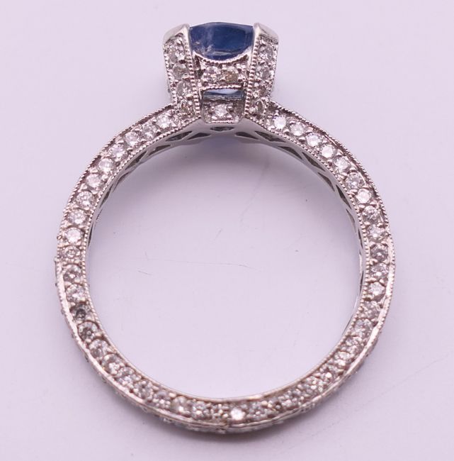 An 18 ct gold sapphire and diamond ring. Total diamond weight approximately 2.5 carats. Total sapphire weight approximately 2 carats. Ring size O.