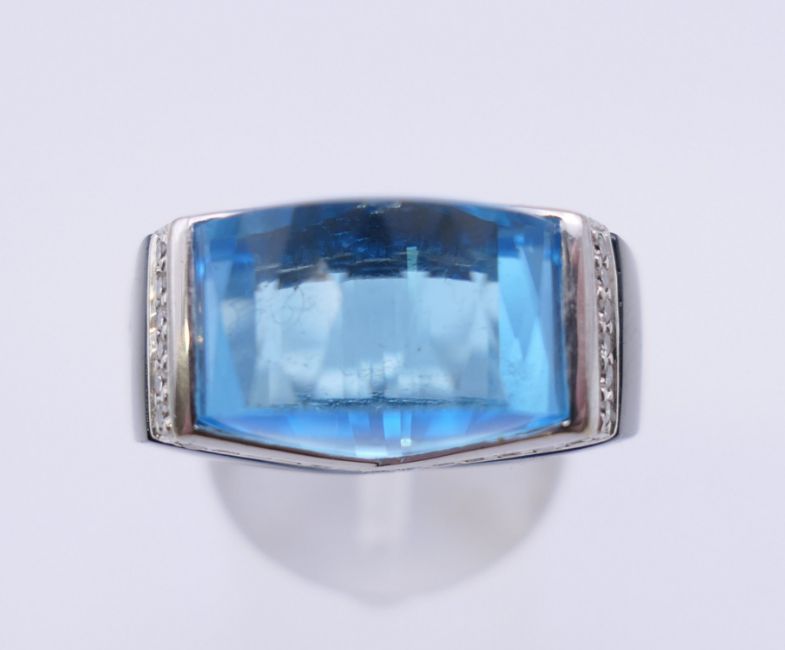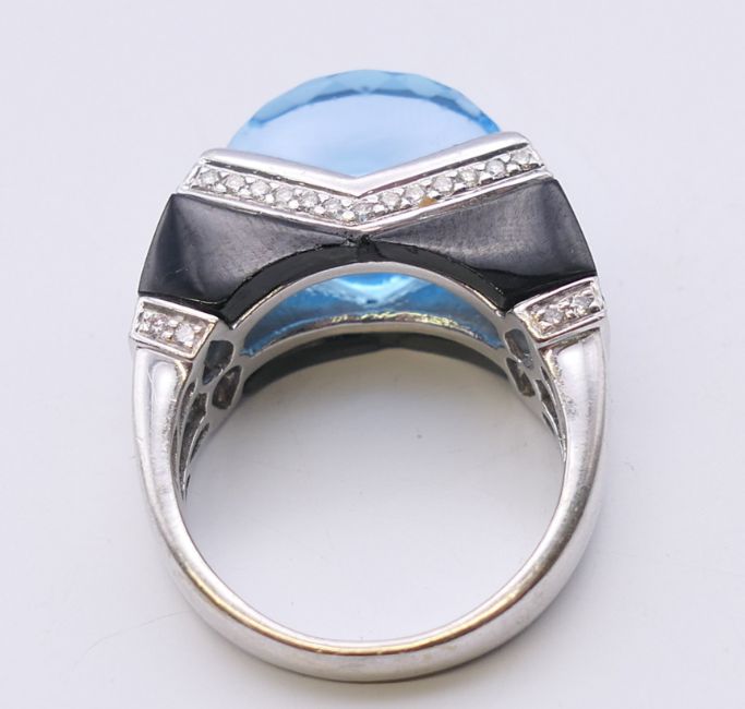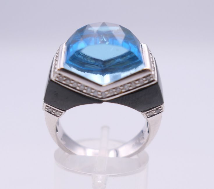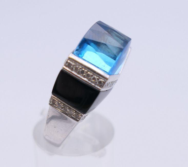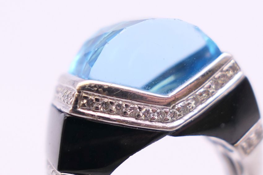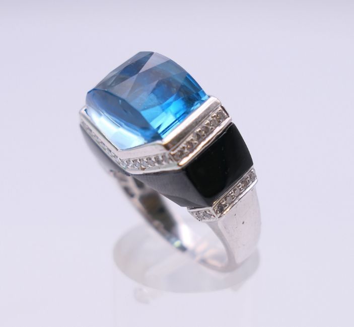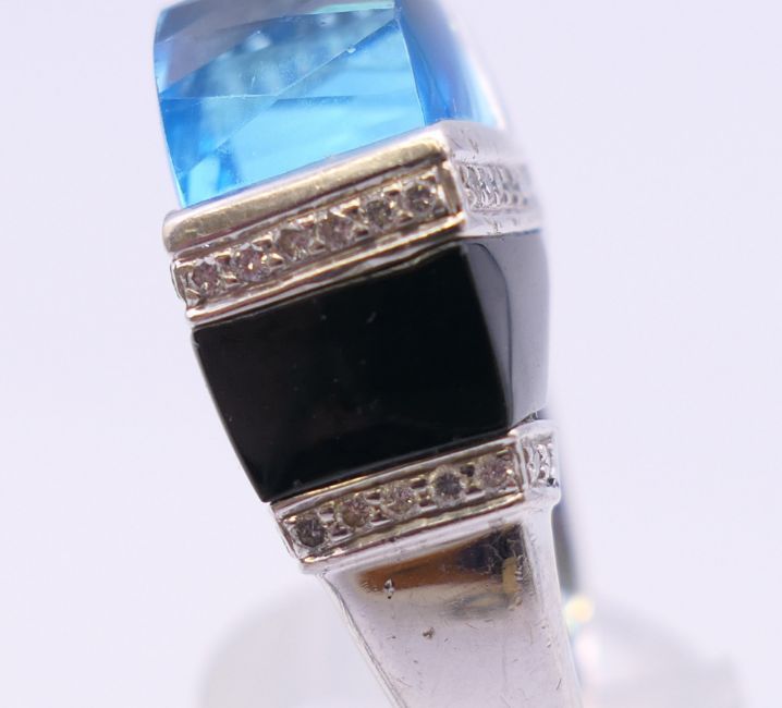 An 18 ct white gold blue topaz, diamond and onyx ring. Ring size P. 2.25 cm wide.