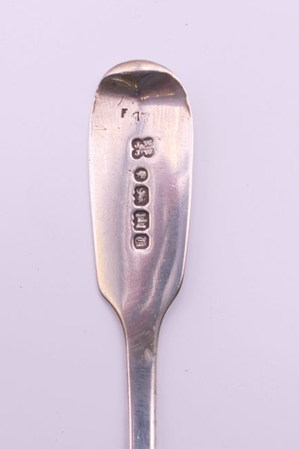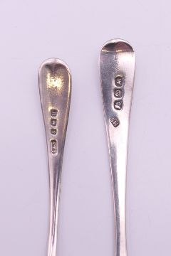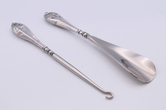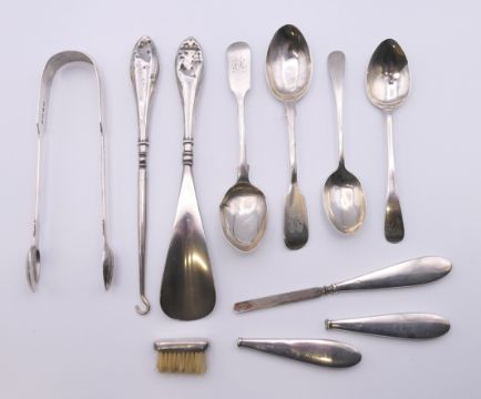 A quantity of various silver and silver handled items, including a pair of sugar tongs, button hook and shoe horn, and a pair of Exeter hallmarked teaspoons. 107.8 grammes of weighable silver.
