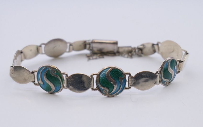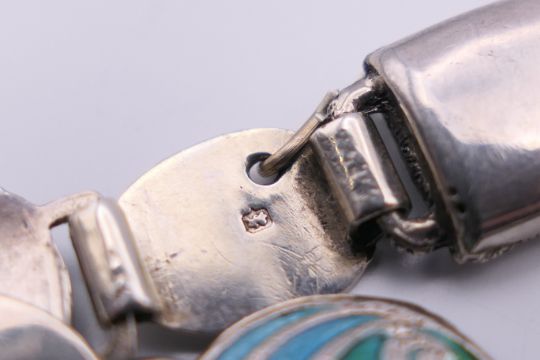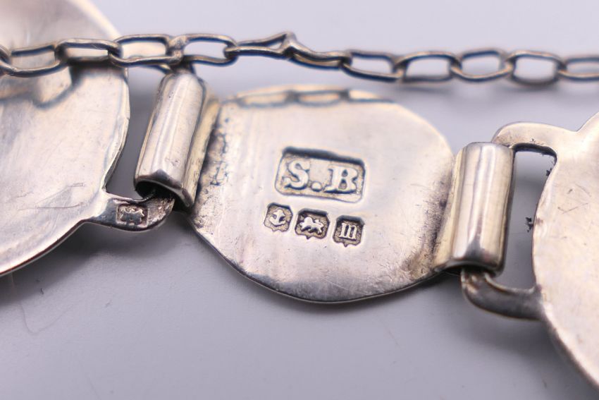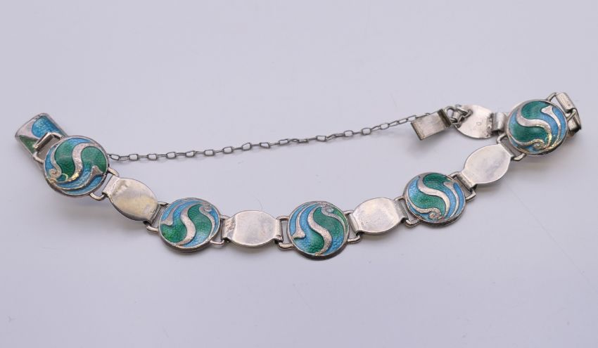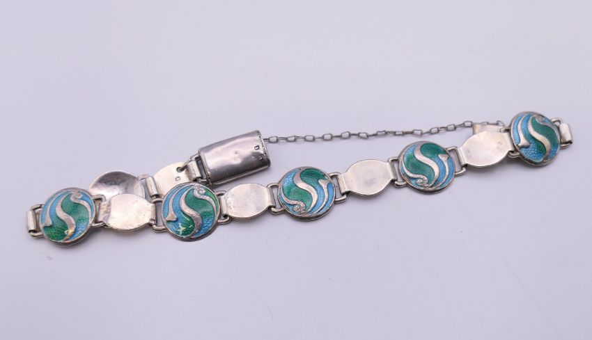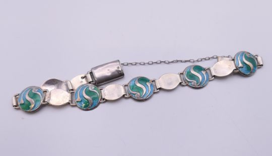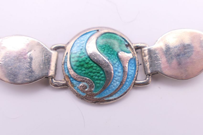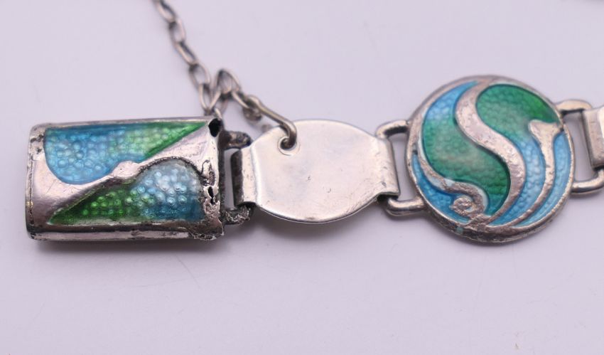 An Arts & Crafts Stainton Brothers silver enamel bracelet, hallmarked for Birmingham 1911. 16 cm long.