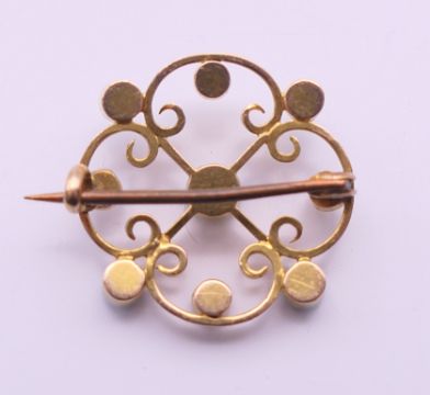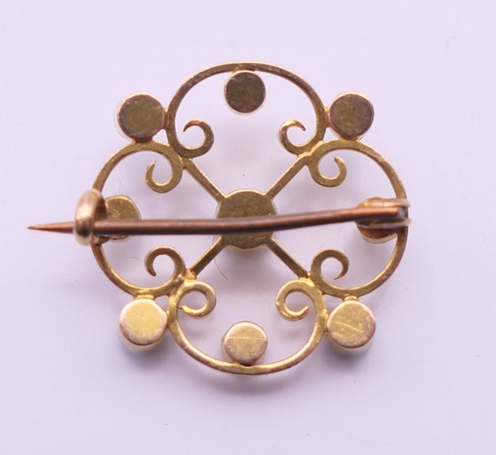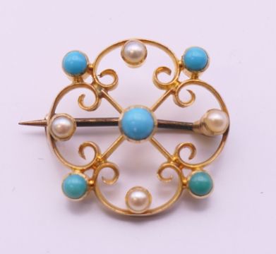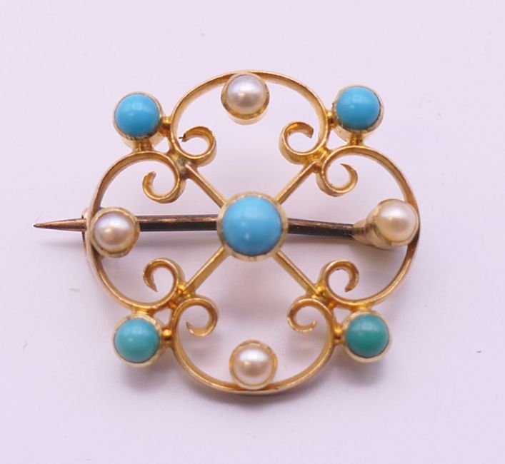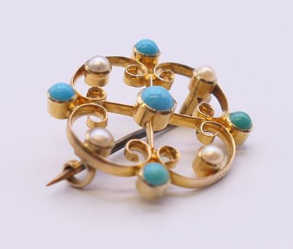 A 19th century 15 ct gold turquoise and pearl brooch. 2 cm diameter.