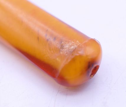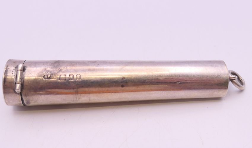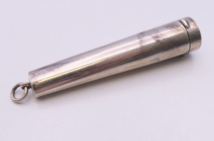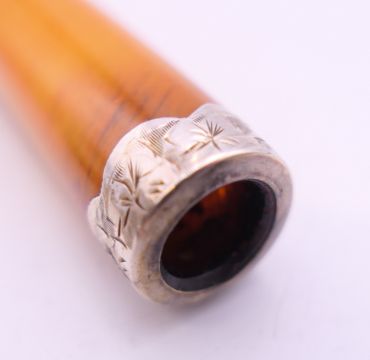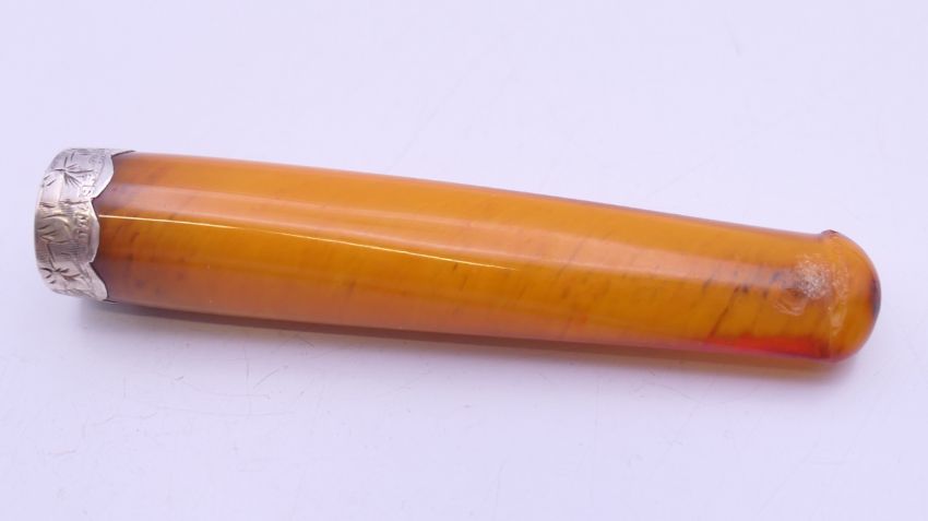 A silver cigarette holder case, containing a silver mounted amber cigarette holder. 7 cm long. 16.6 grammes total weight.