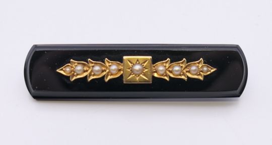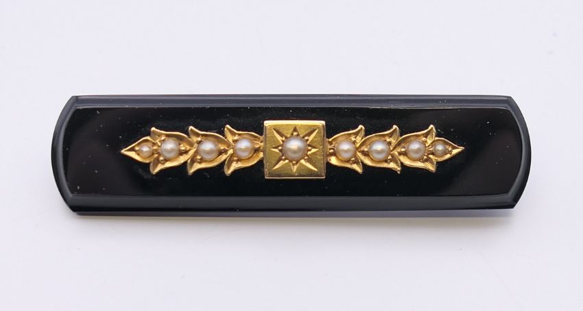 An unmarked gold onyx and seed pearl brooch. 5.5 cm long.