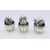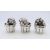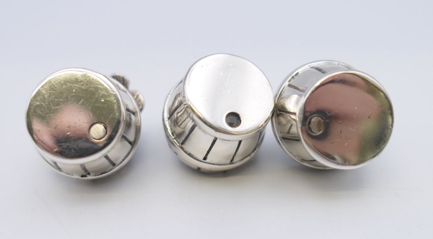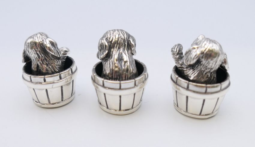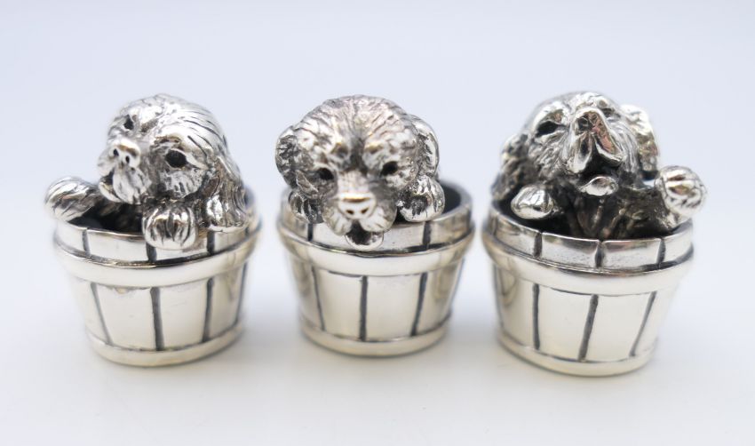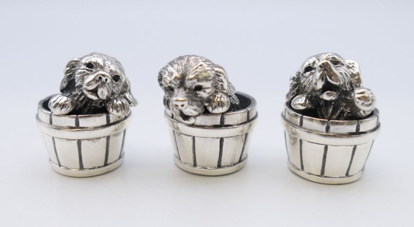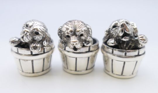 Three Saturno 925 silver puppies in barrels. Each approximately 2.5 cm high.