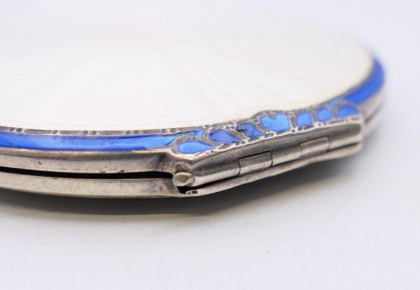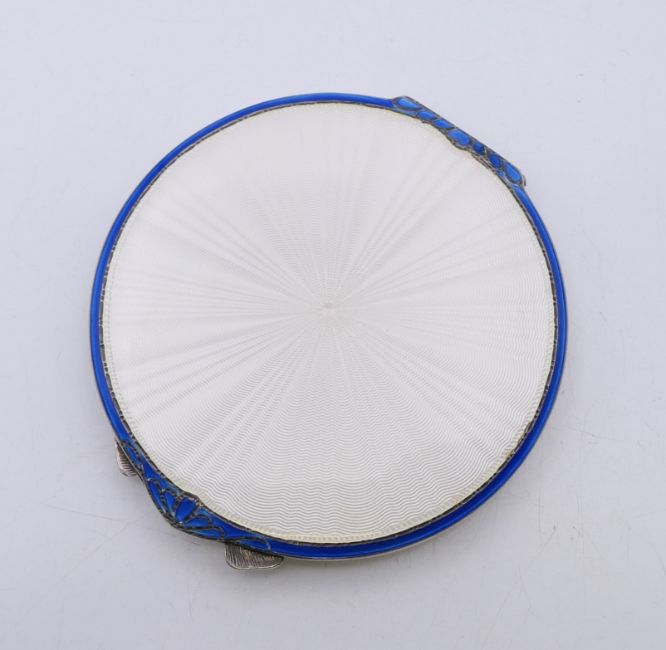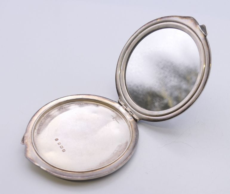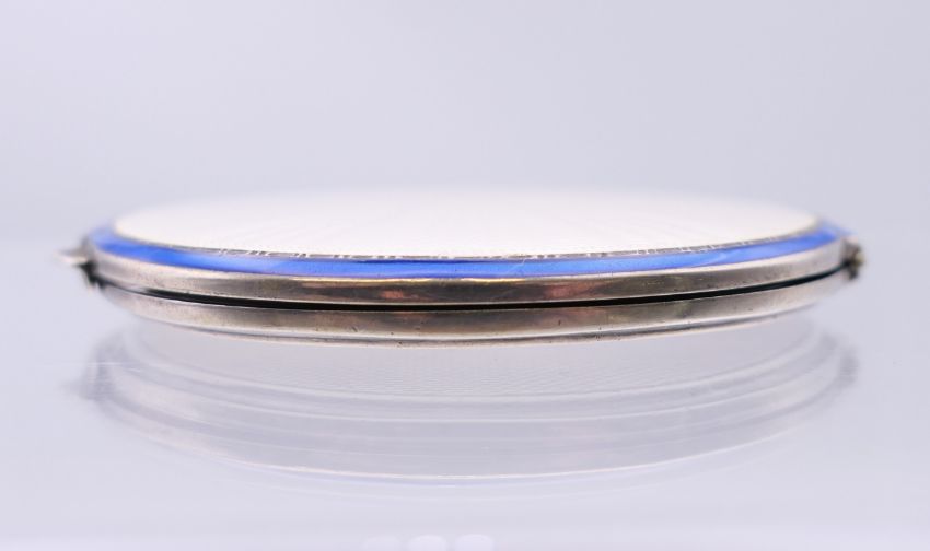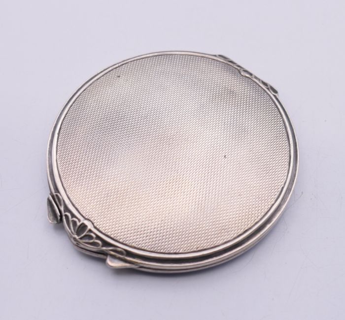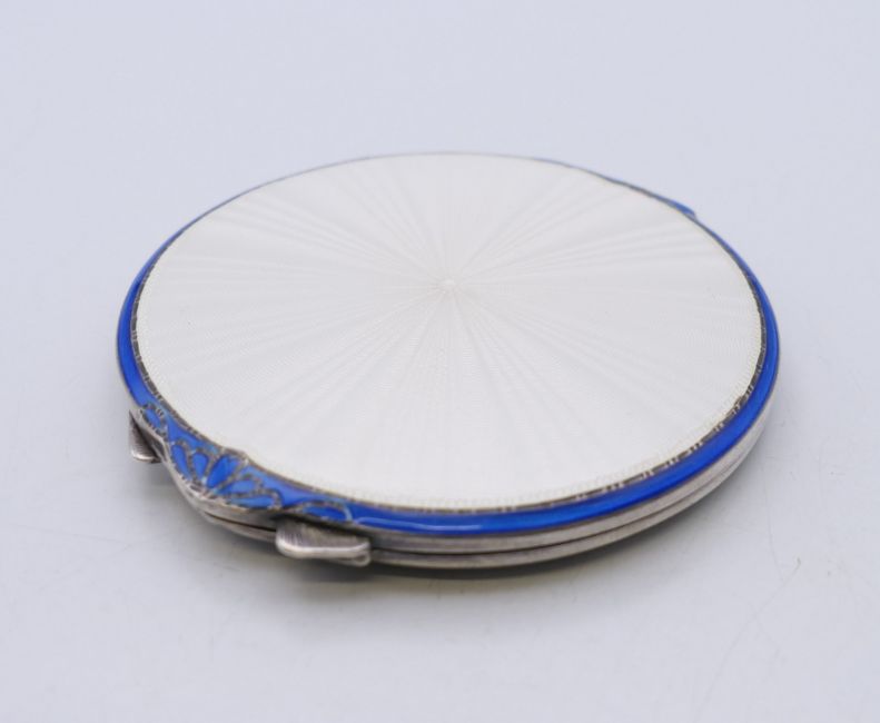 An enamel decorated silver compact, hallmarked for Birmingham 1949. 7.5 cm diameter.