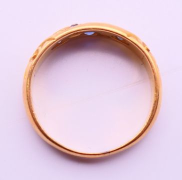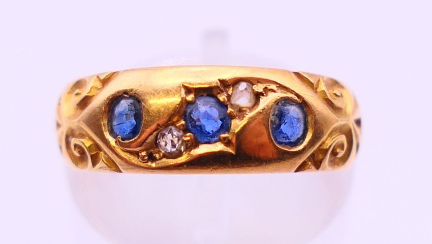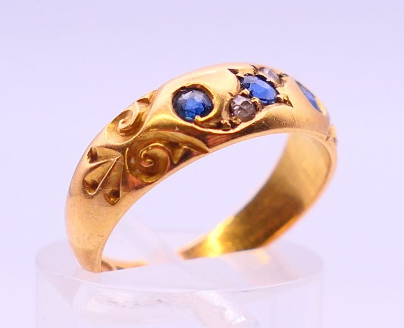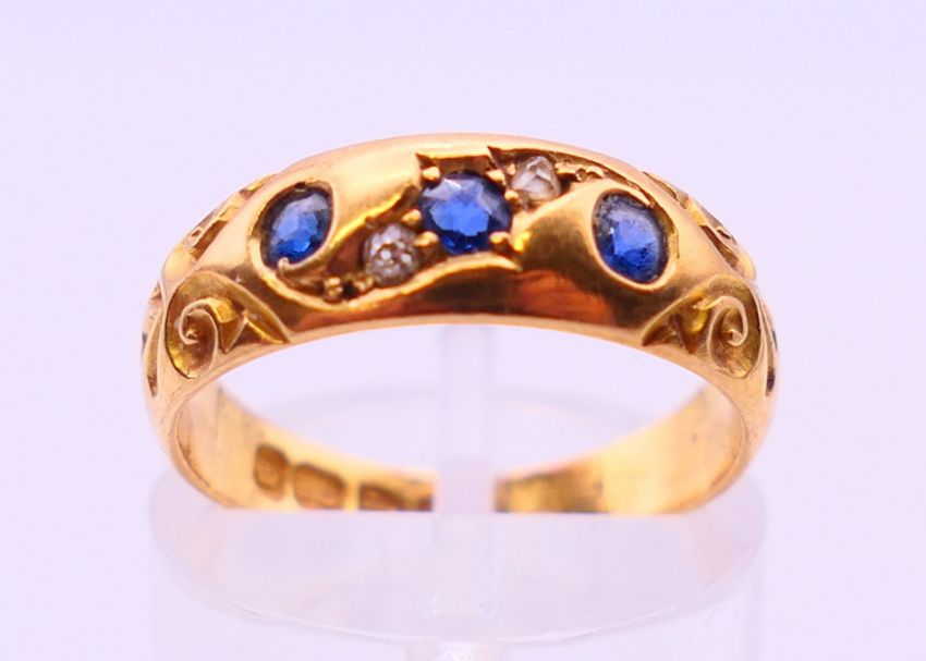 An 18 ct gold diamond and sapphire ring. 4 grammes. Ring size L/M.