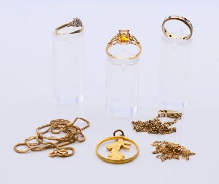 A quantity of various gold jewellery etc, to include three 9ct chains, three 9ct rings and a pendant. Longest chain 46 cm long. 11.6 grammes total weight excluding pendant.