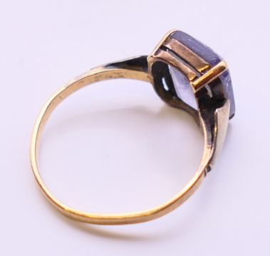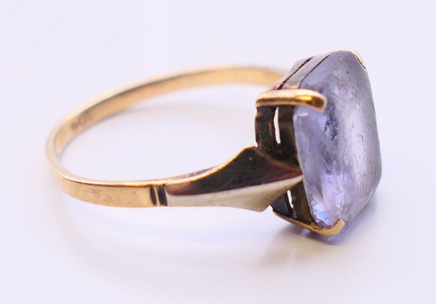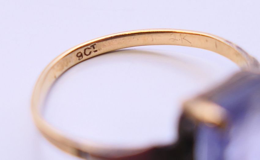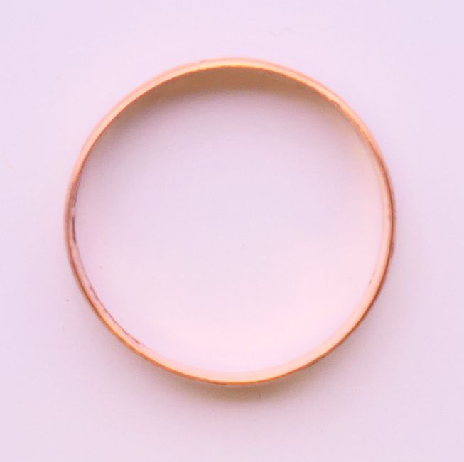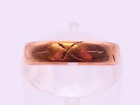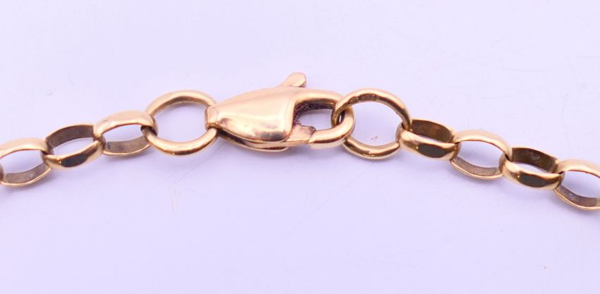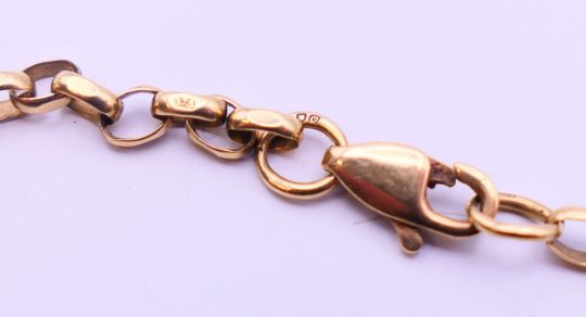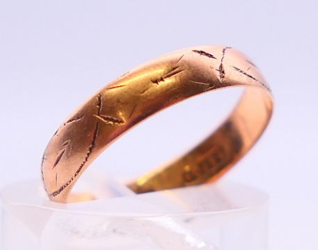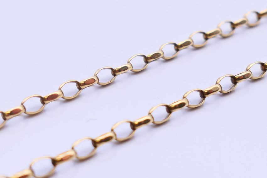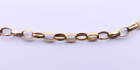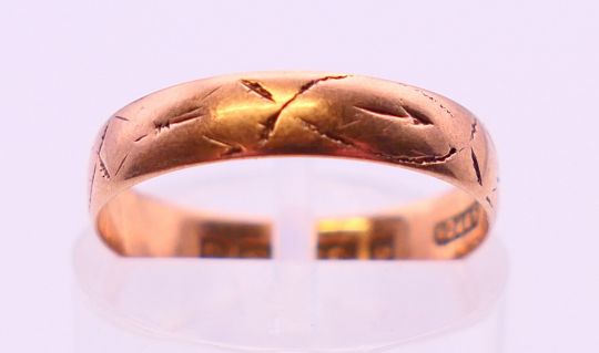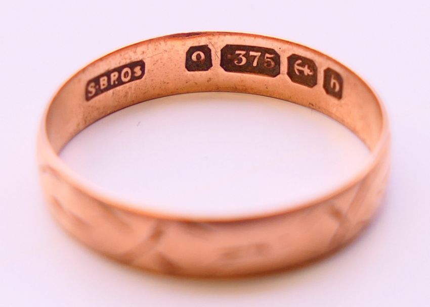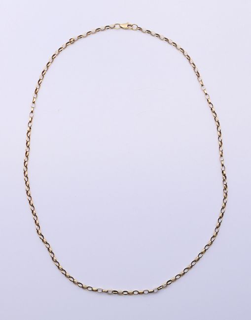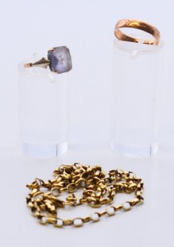 A 9 ct gold chain, a 9 ct gold wedding ring and a 9 ct gold ring. Chain 50 cm long. 10 grammes total weight.