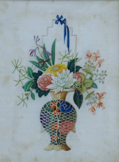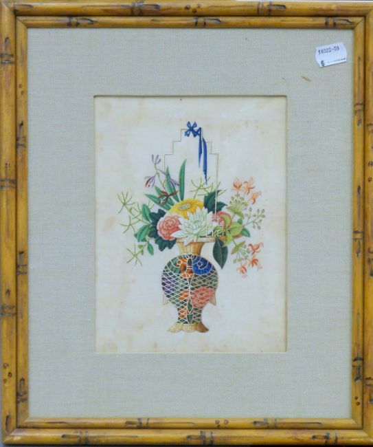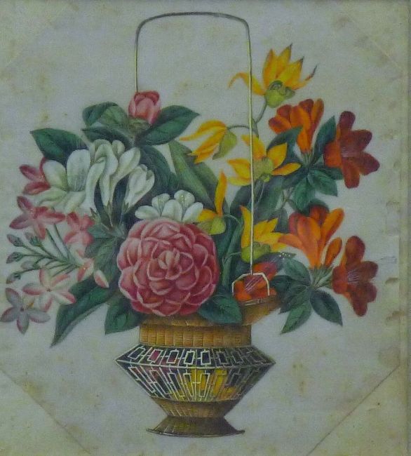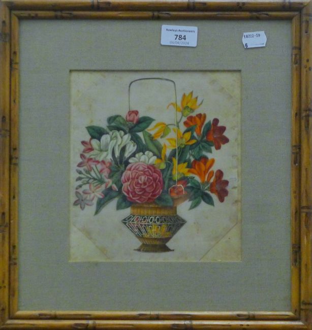 A pair of 19th century Chinese rice paper paintings each depicting a flowering basket and each in a faux bamboo frame. The largest 33 x 35.5 cm.