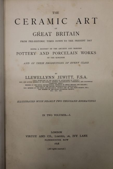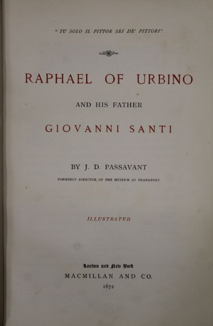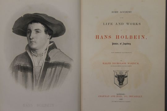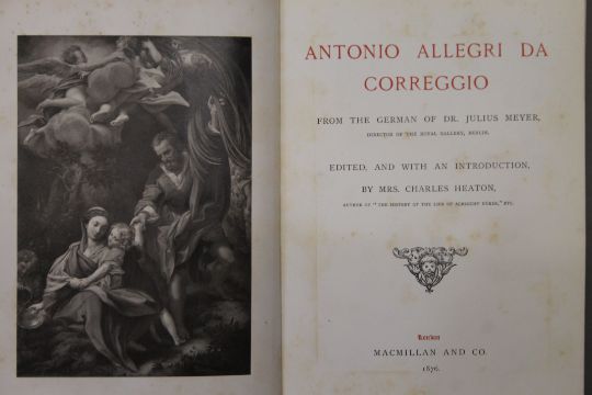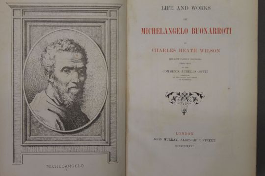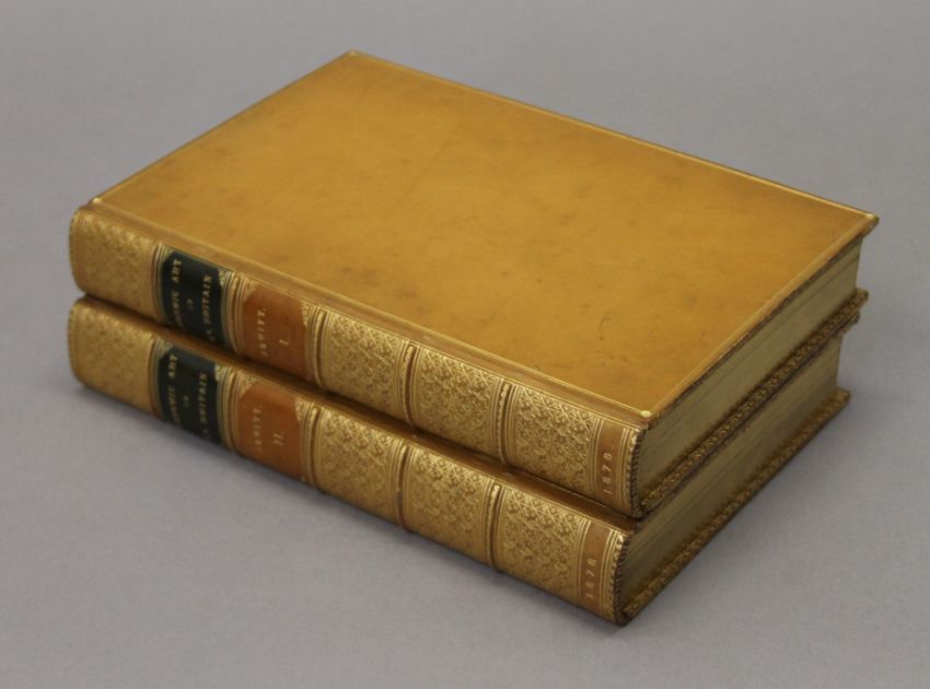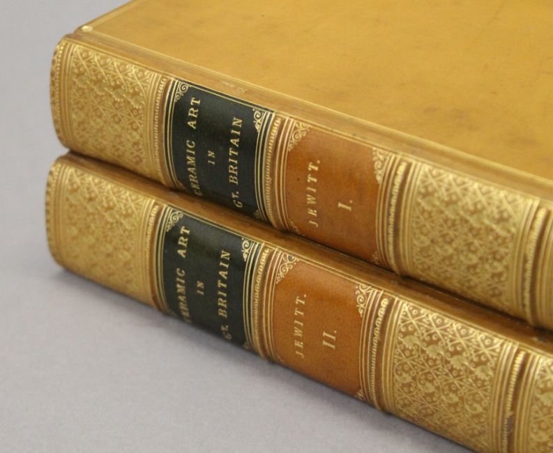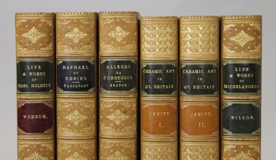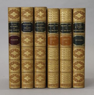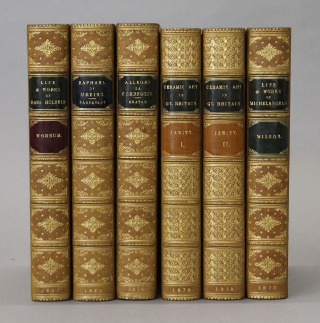 Jewitt (L), The Ceramic Art of Great Britain, 2 vols, first edition, 1878; Passavant, Raphael of Urbino, 1872; Heaton, Antionio Allegri da Correggio, 1876; Wilson, Life and Works of Michelangelo Buonarroti, 1876; Wornum, Life and Works of Hans Holbein, 1867; 4 vols, all finely bound in full calf, all edges gilt by Leighton. (6)