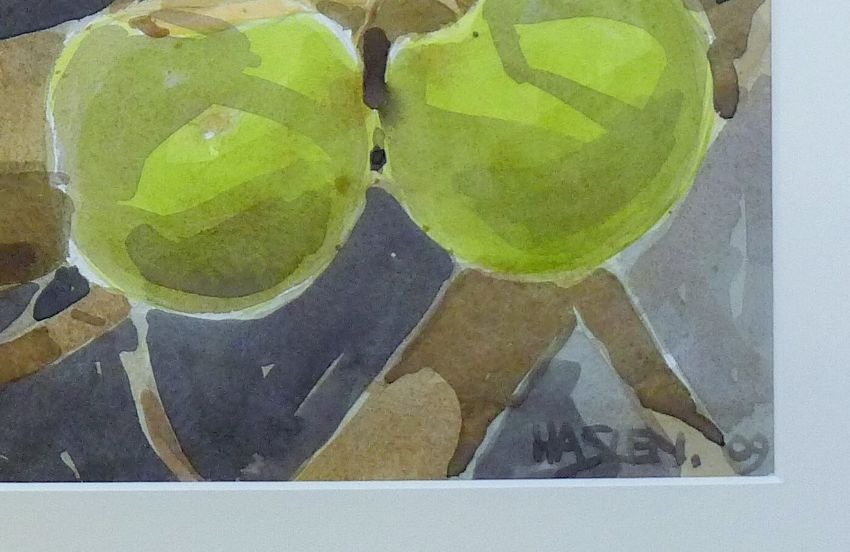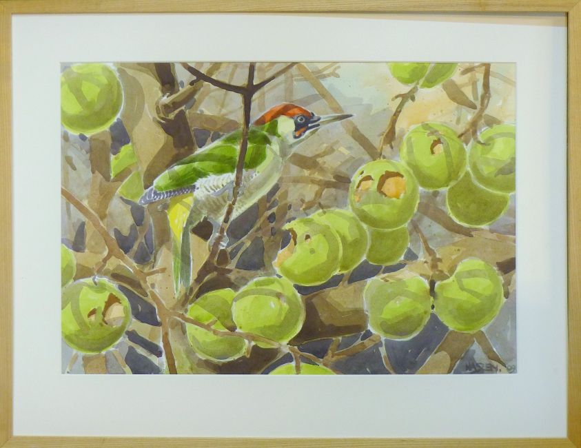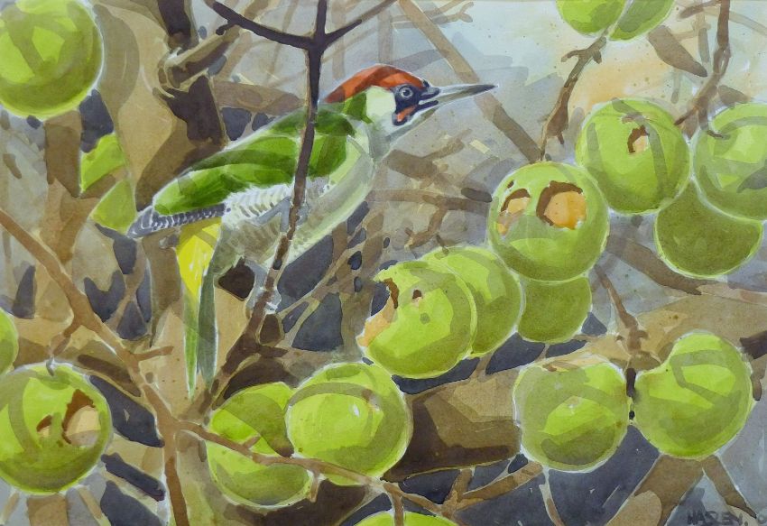 HASLEN, ANDREW (born 1951) British (AR), Green Woodpecker on Apples, watercolour, signed, framed and glazed. 47 cm x 69 cm.