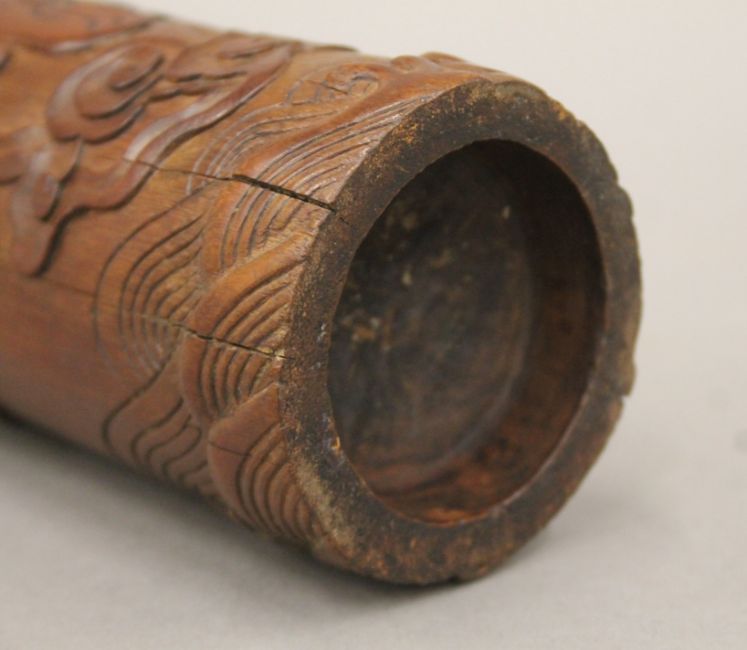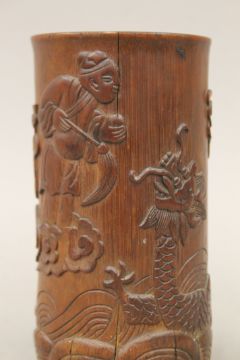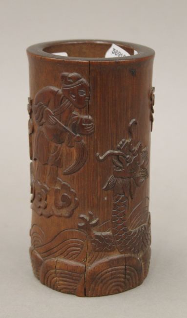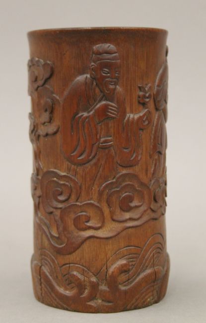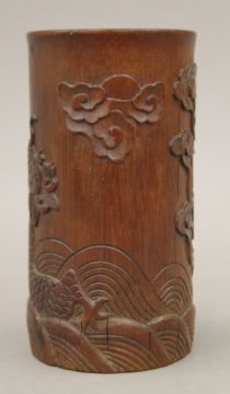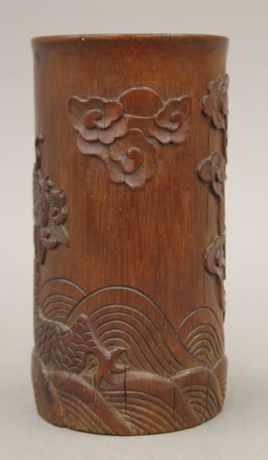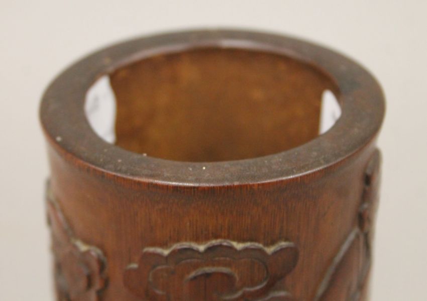 A late 19th/early 20th century Chinese carved bamboo brush pot. 13.5 cm high.