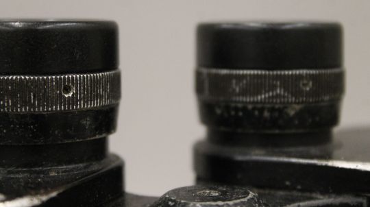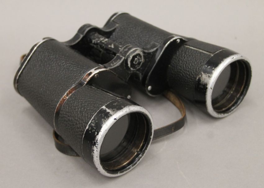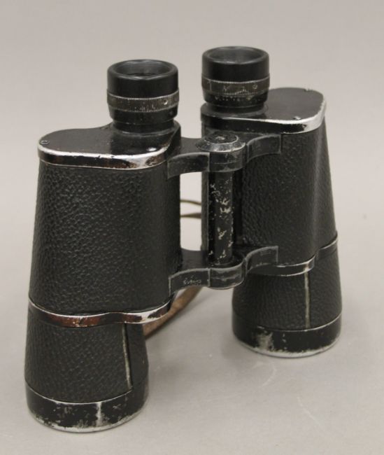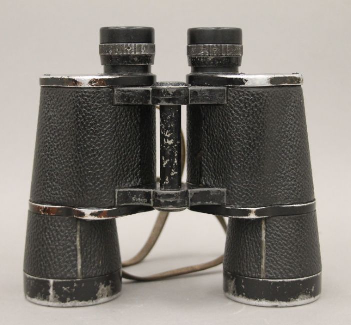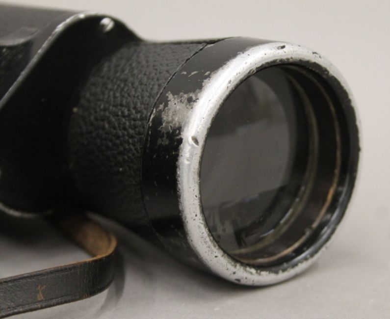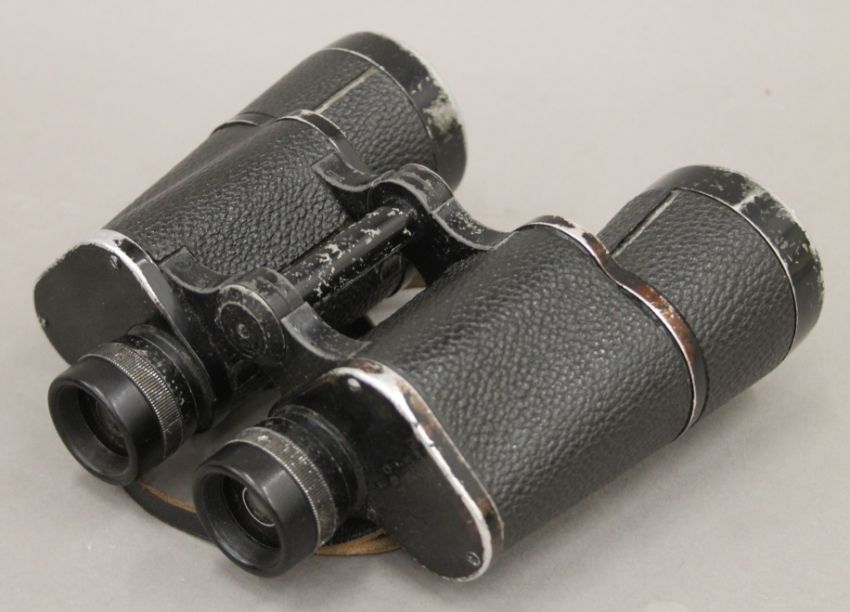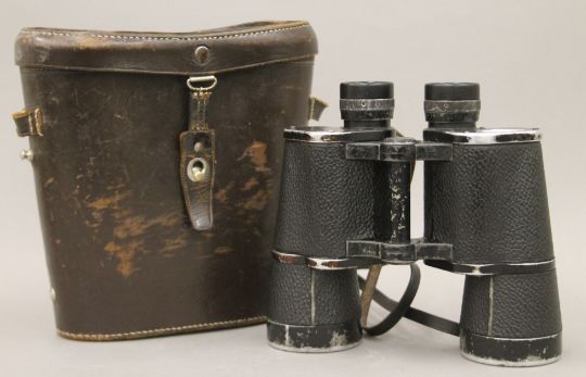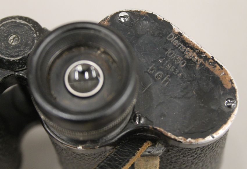 German WWII 10 x 50 Dienstglas binoculars, the body marked B E H + which indicates they were manufactured by Ernst Leitz of Wetzlar and the + symbol indicating lubricant type 1442 for use in cold weather (-40 degrees Celsius) with later English damaged leather case. These field glasses were normally issued to specialists such as Panzer commanders and Artillery observers as opposed to the standard issue 6 x 30 binoculars. 20 cm high.