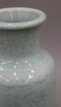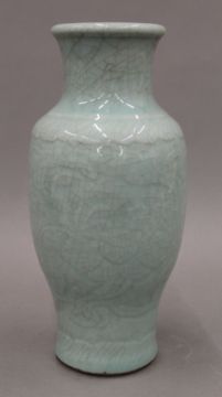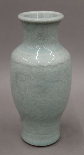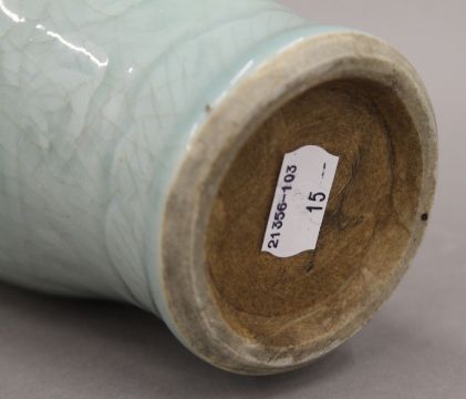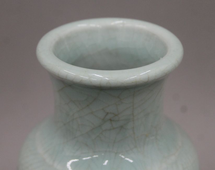 An 18th century Chinese porcelain celadon vase with carved background and crackleware glaze. 25 cm high.