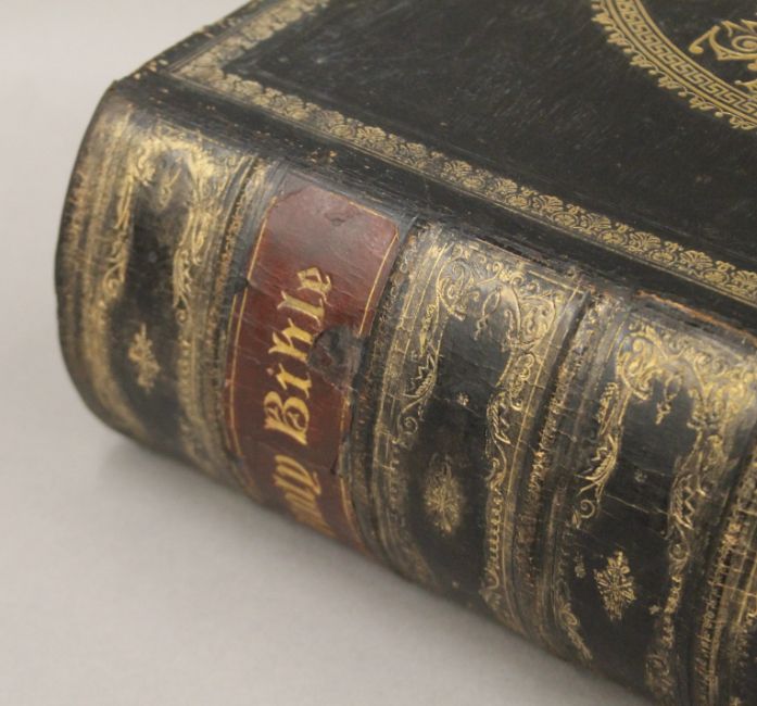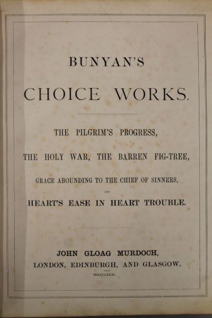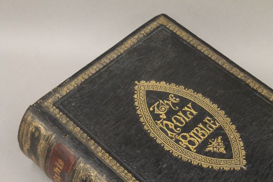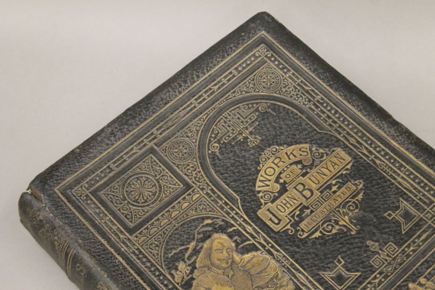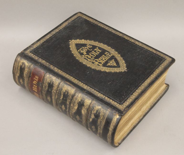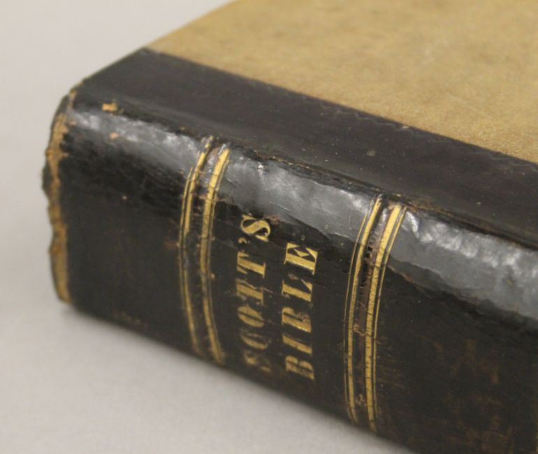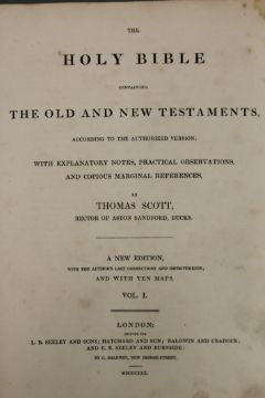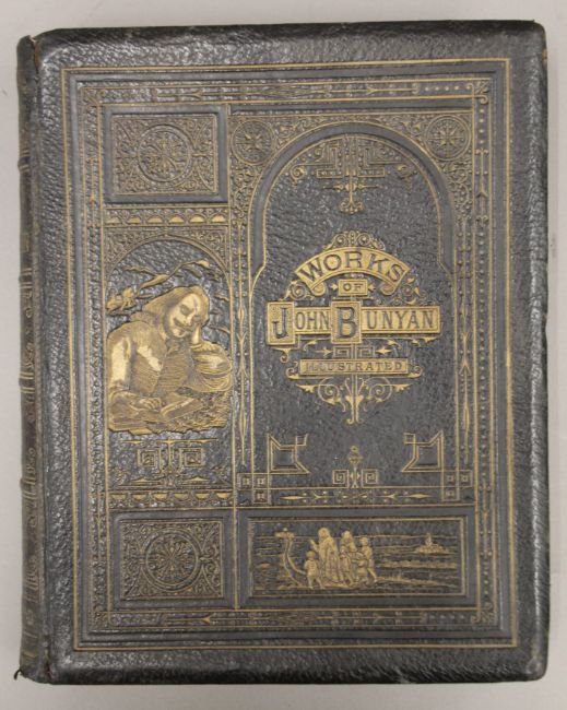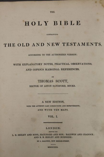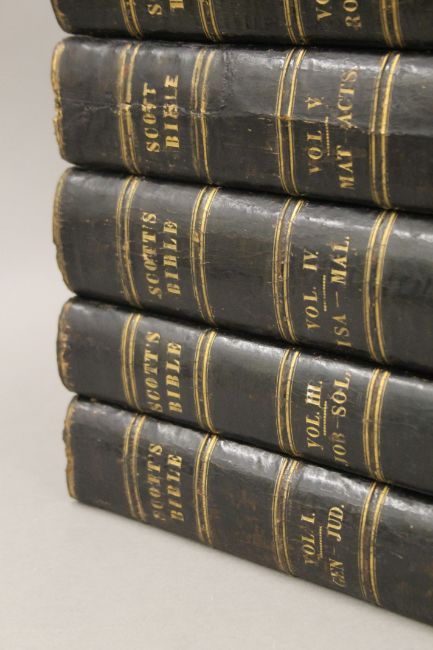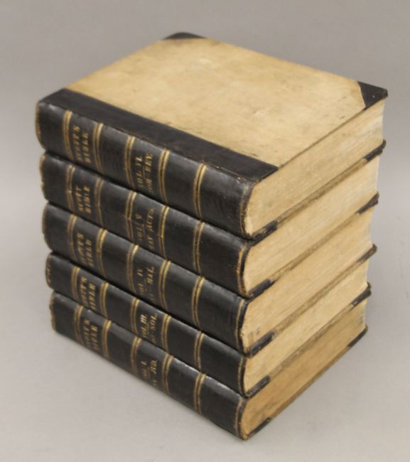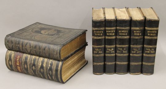 Cassell's The Family Bible, illustrated with explanatory notes, full straight-grained calf with gilt decoration together with The Works of John Bunyan, 1881, full morocco with gilt decoration and Scott's Bible, 1830, five volumes, half calf.