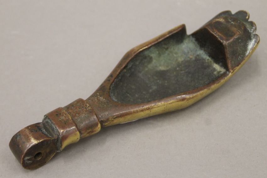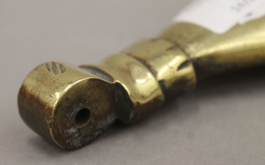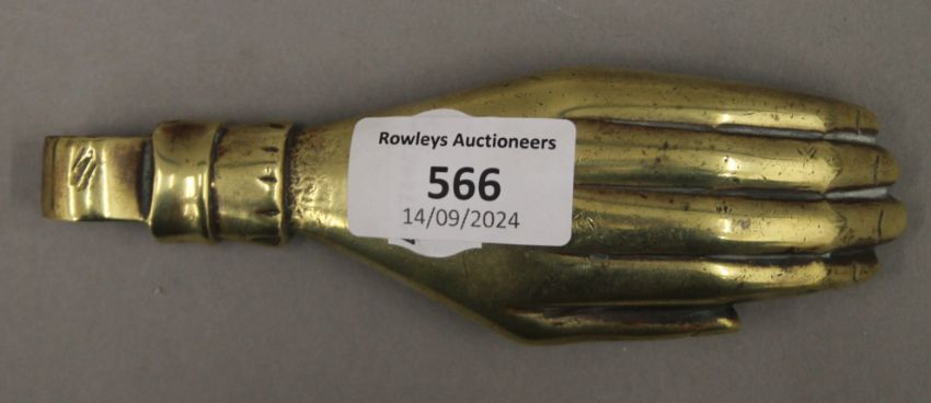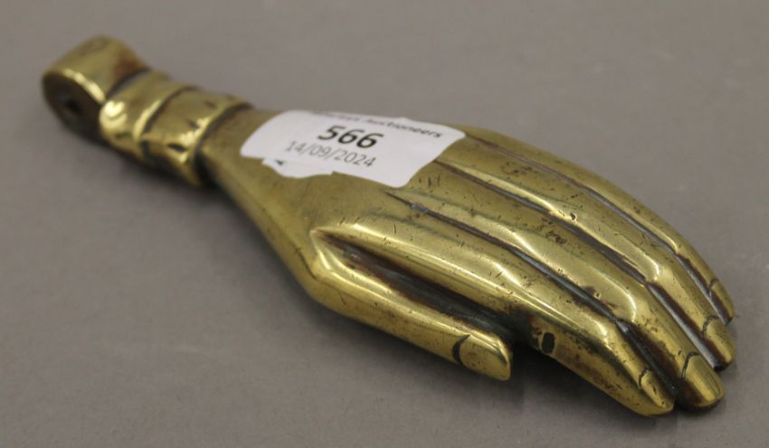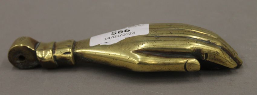 A Victorian brass door knocker in the form of a hand. 14.5 cm long.