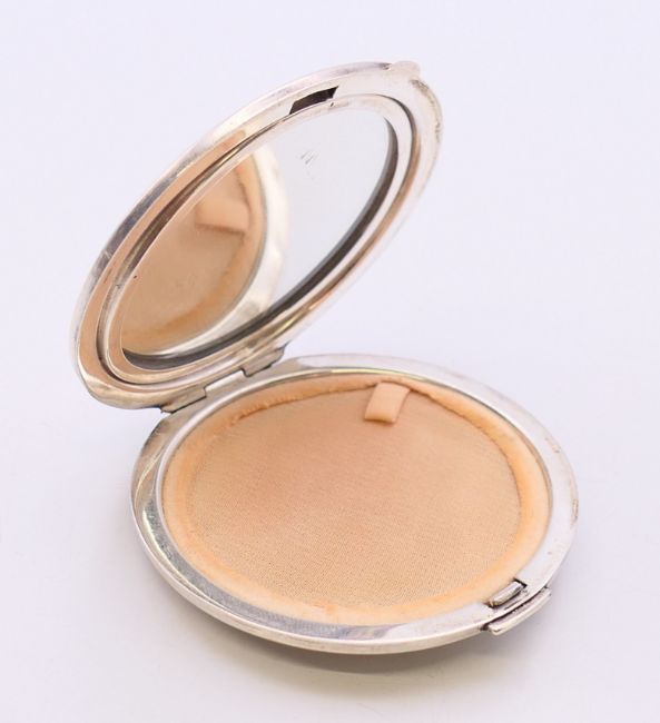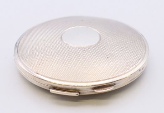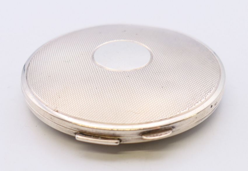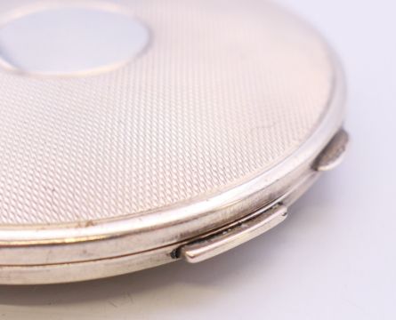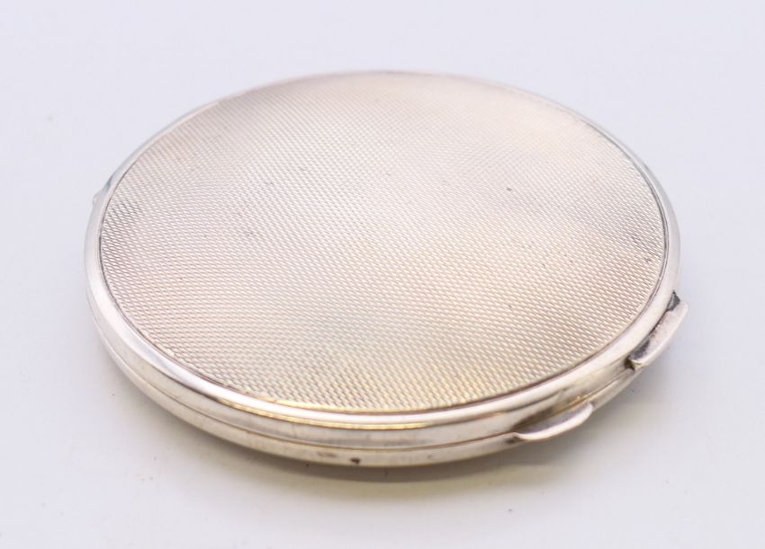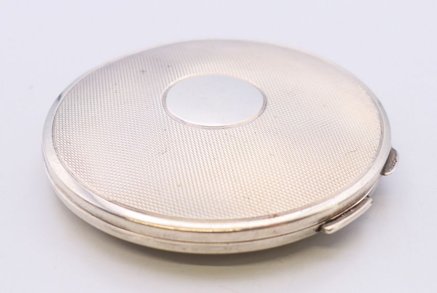 A silver ladies compact, hallmarked Birmingham 1948. 6.5 cm diameter. 57.5 grammes total weight.