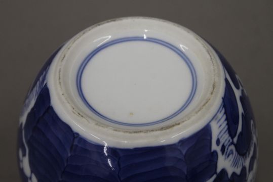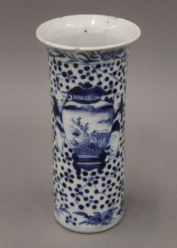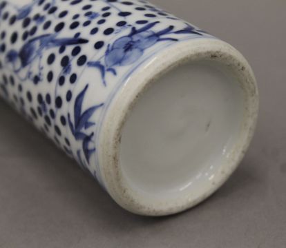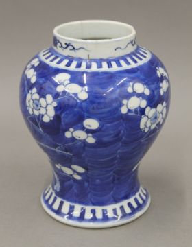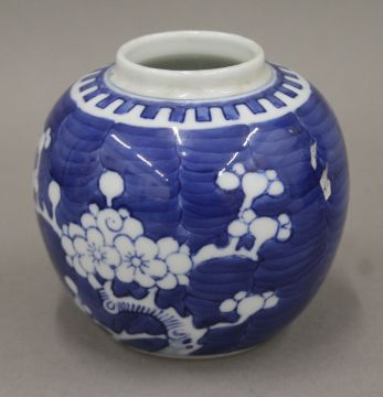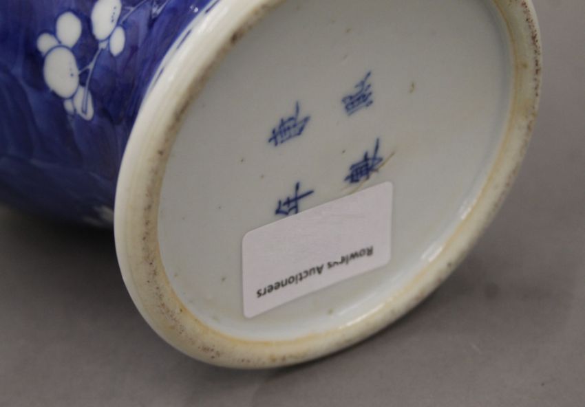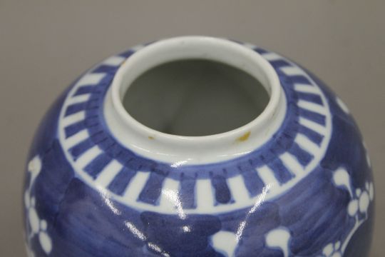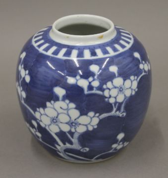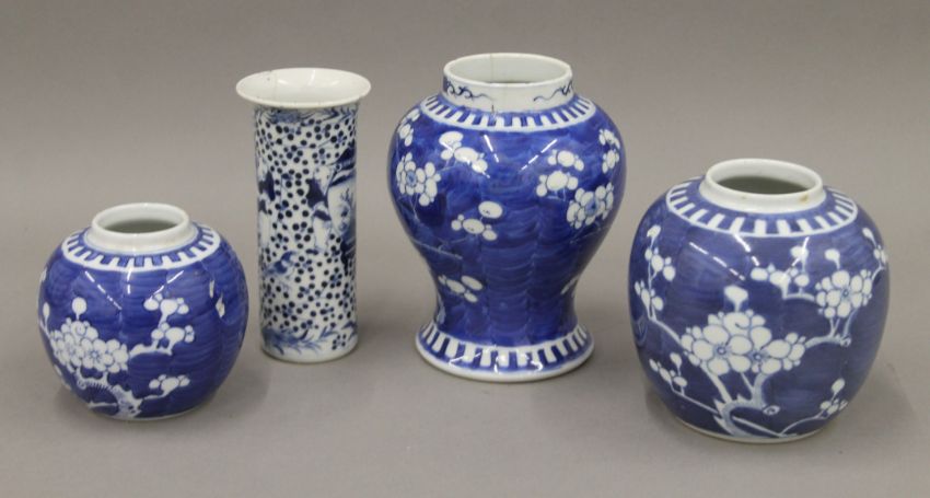 A 19th century Chinese porcelain blue and white prunus vase, two ginger jars and a sleeve vase. The former 16.5 cm high.