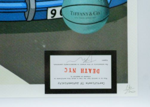 DEATH NYC, (Contemporary) American, 'Simpson 9/11', a signed limited edition print bearing a Certificate of Authenticity, an embossed seal and a blind stamp, numbered 16/100, signed and dated 2024, framed and glazed. 45 cm x 32 cm.