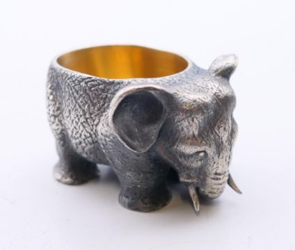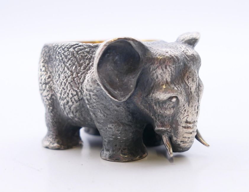 A silver elephant form salt bearing Russian marks. 5 cm long.