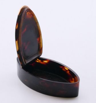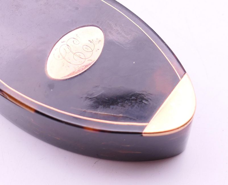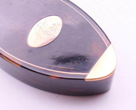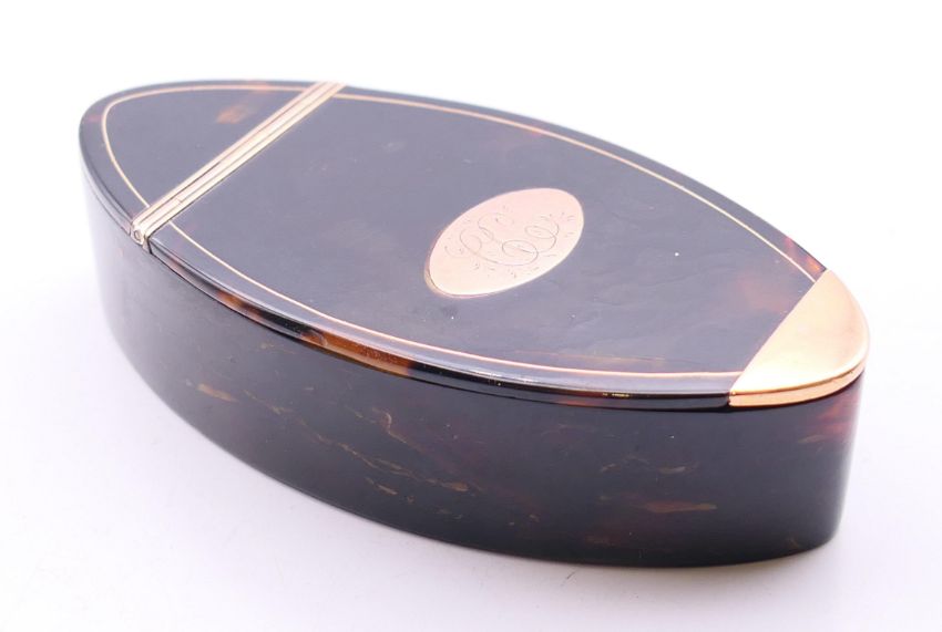 An unmarked gold mounted tortoiseshell snuff box. 9 cm long.