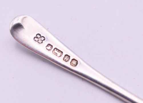 A Georgian silver mustard spoon, a Victorian silver mustard spoon and a Victorian salt spoon. The latter 6 cm long. 24.9 grammes.