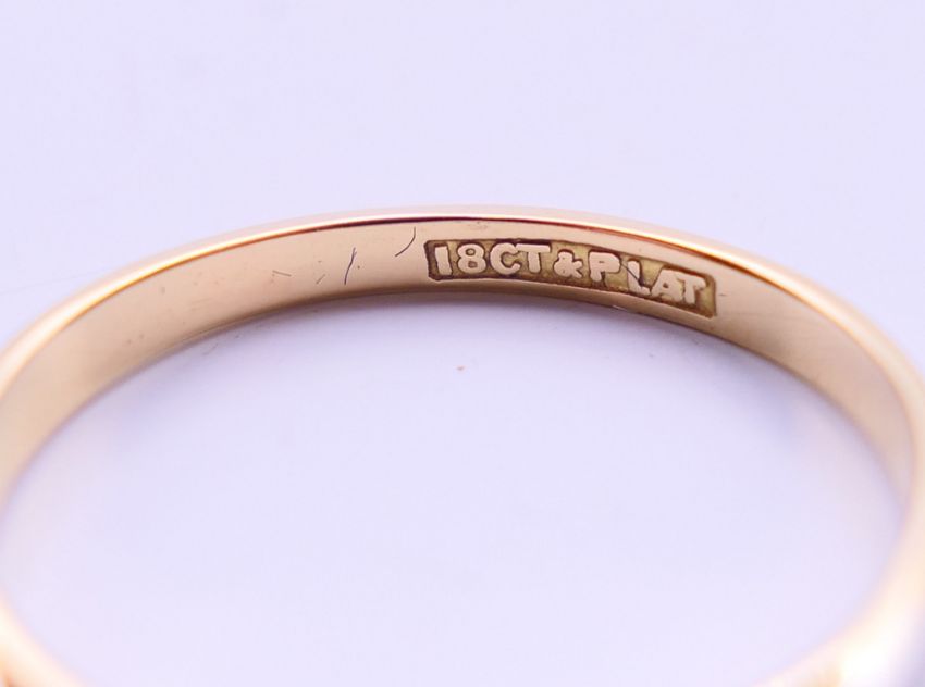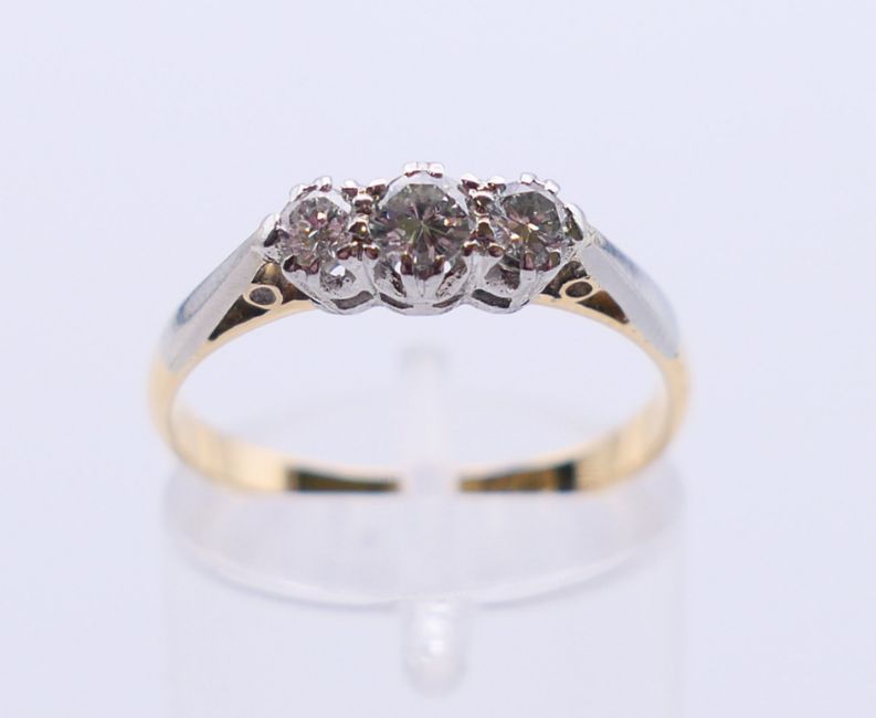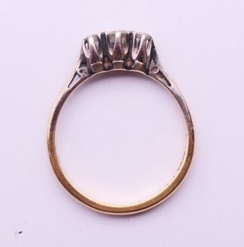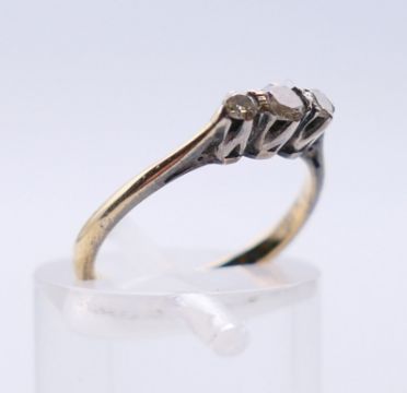 Two small 18 ct gold and platinum three-stone diamond rings. The largest ring size O, the other J. 4.4 grammes total weight.