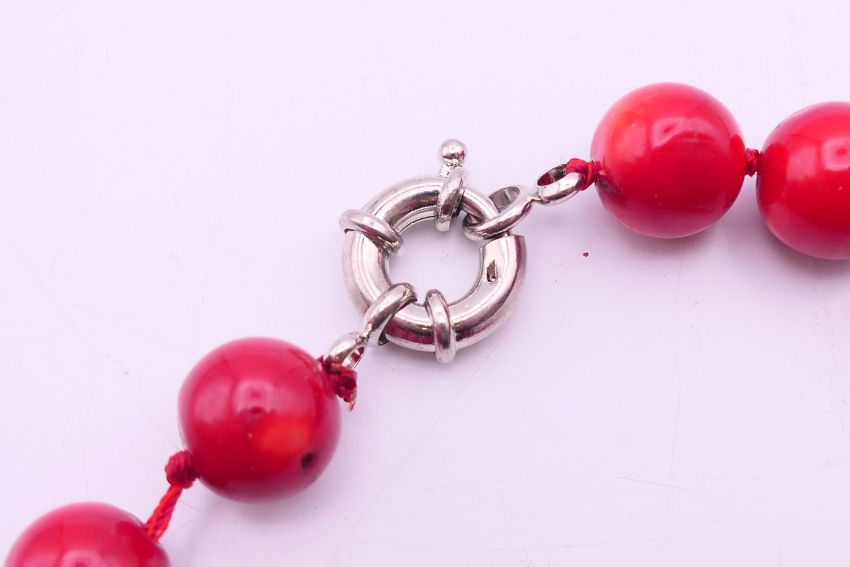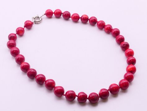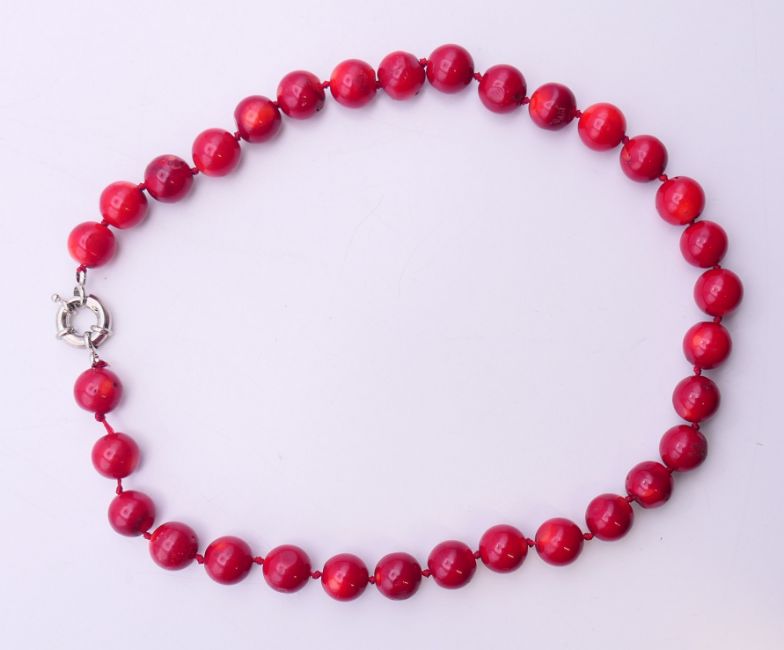 A coral bead necklace. 46 cm long.