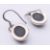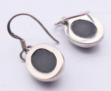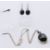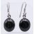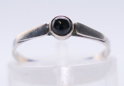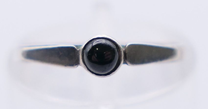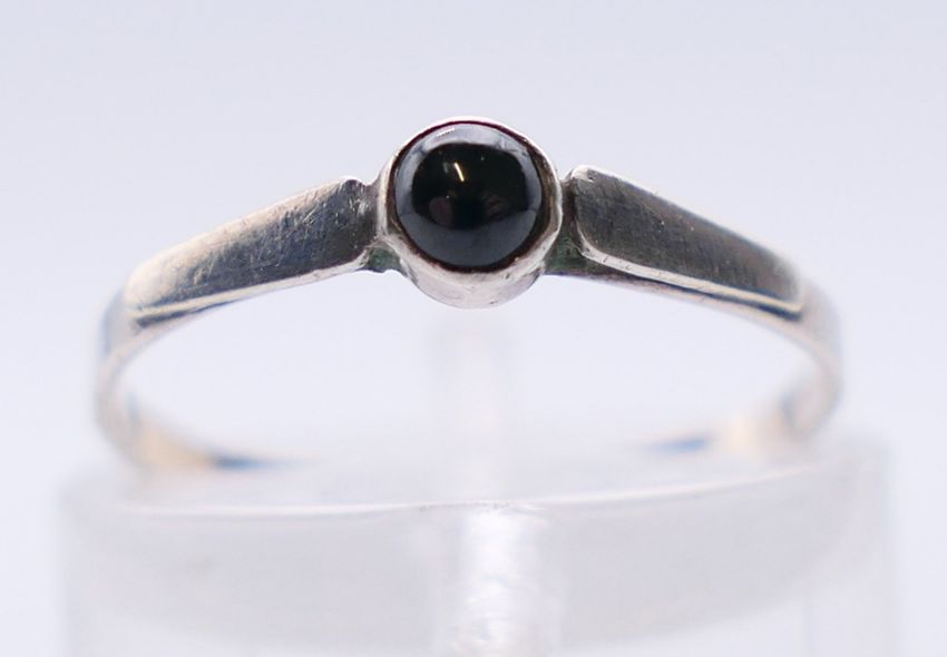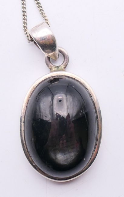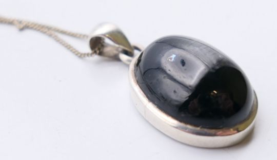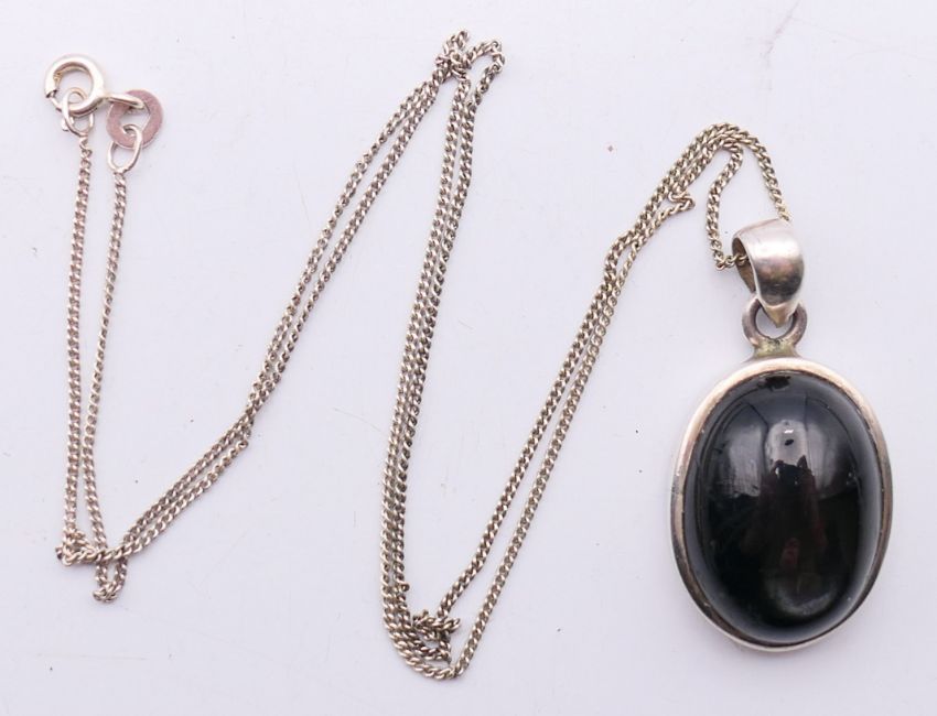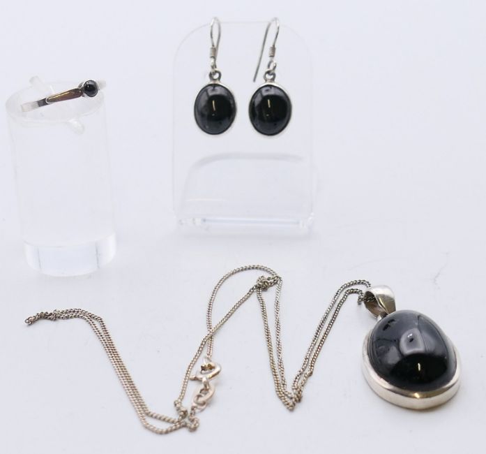 A suite of jet set jewellery to include a pendant on chain, a pair of earrings and a ring. The pendant 2.5 cm high.