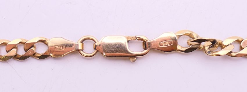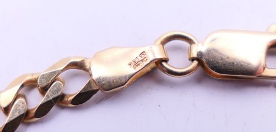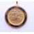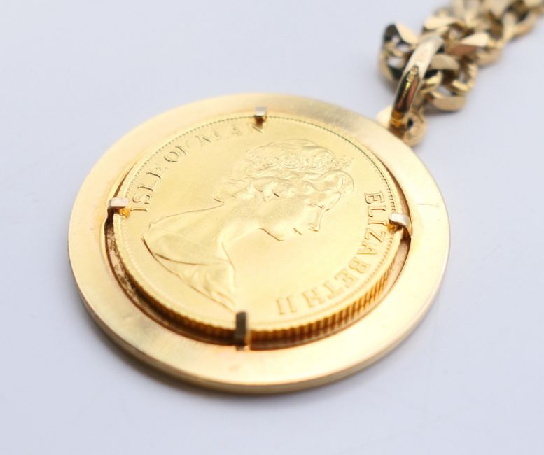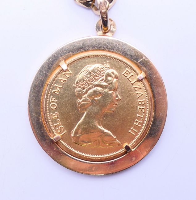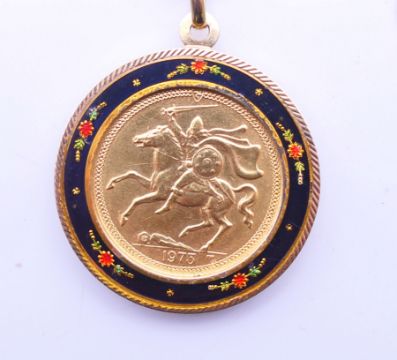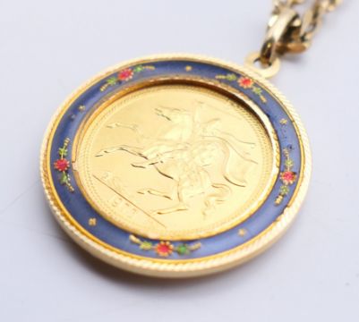 An Isle of Mann 1973 sovereign set in 9 ct gold enamelled circular frame on a 9 ct gold curb link chain. Pendant 3 cm diameter, chain 80 cm long. 37.9 grammes total weight.Note: see Lot 11 for matching bracelet.