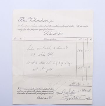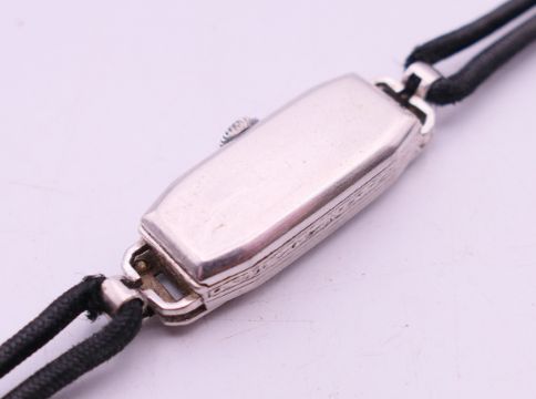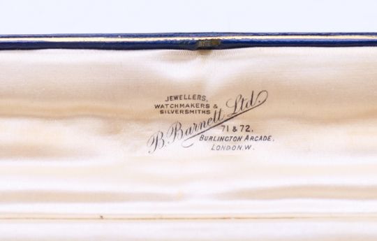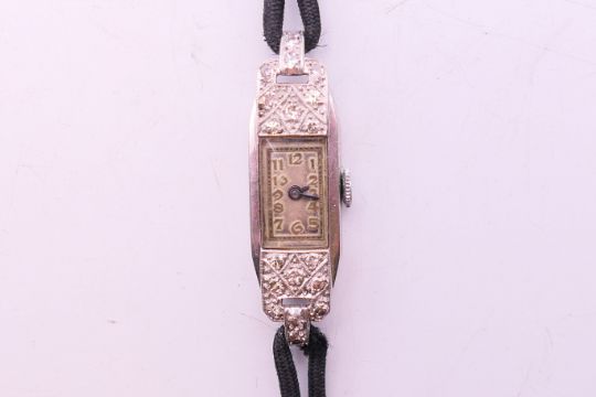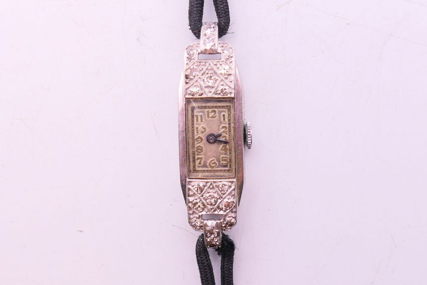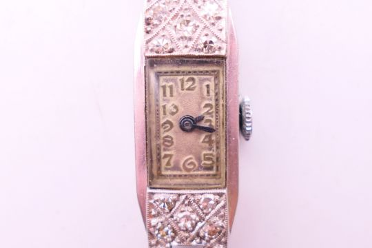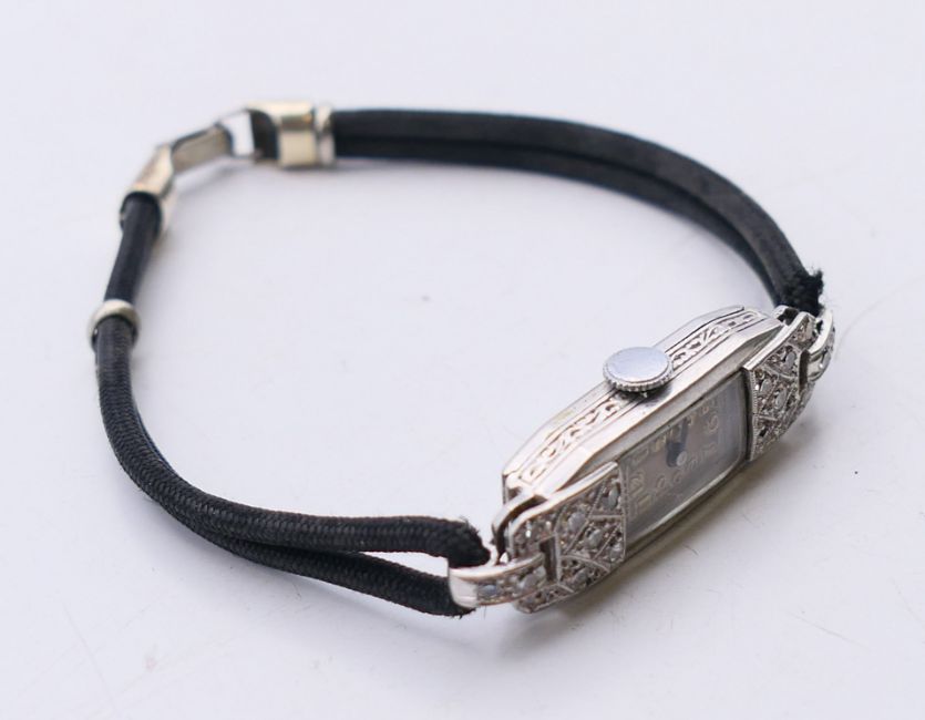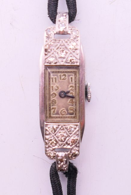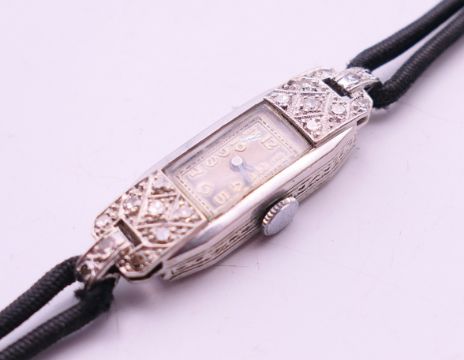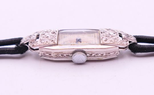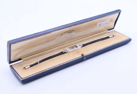 A boxed Art Deco diamond set cocktail watch together with valuation dated 1969, the box marked for B Barnett Ltd of 71 & 72 Burlington Arcade, London. Watch 3.5 x 1 cm.