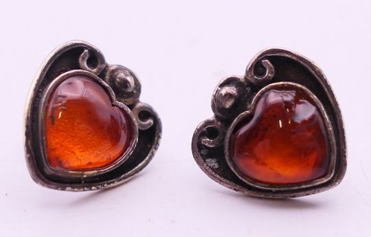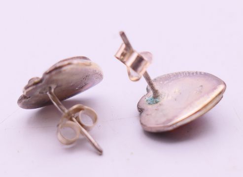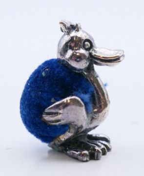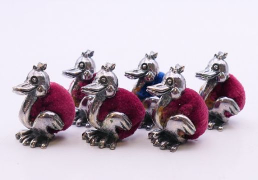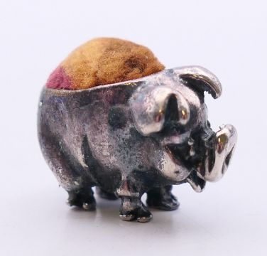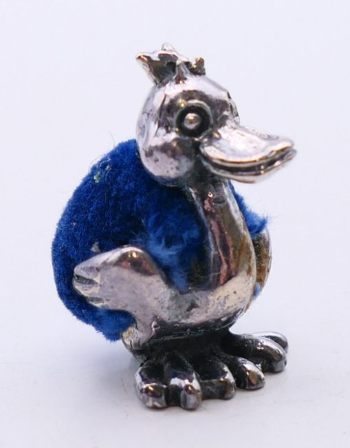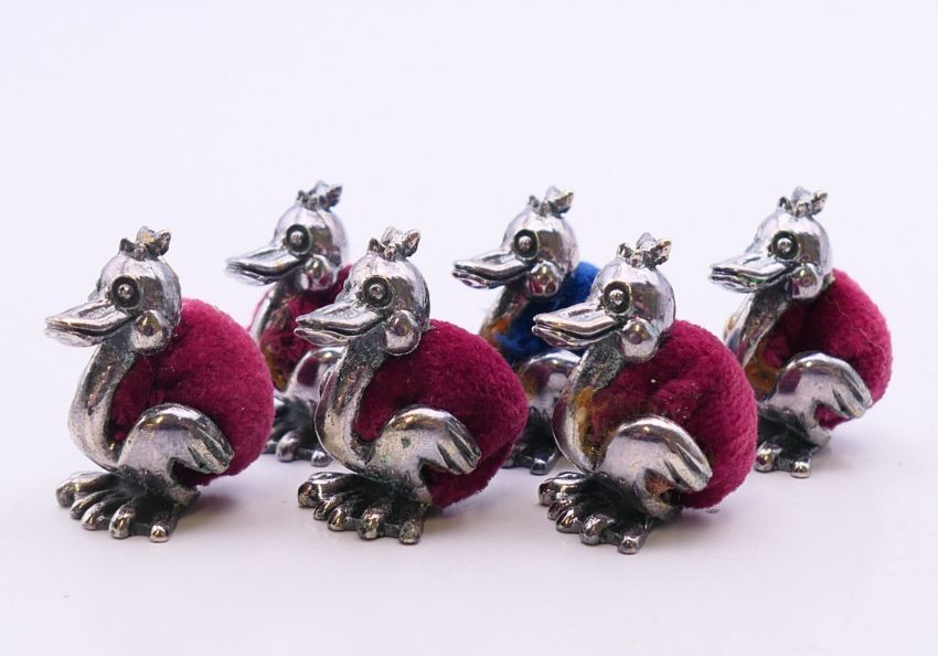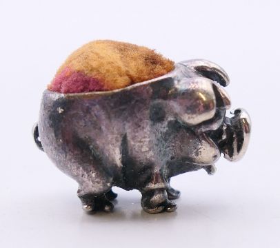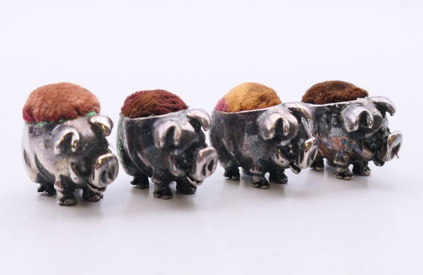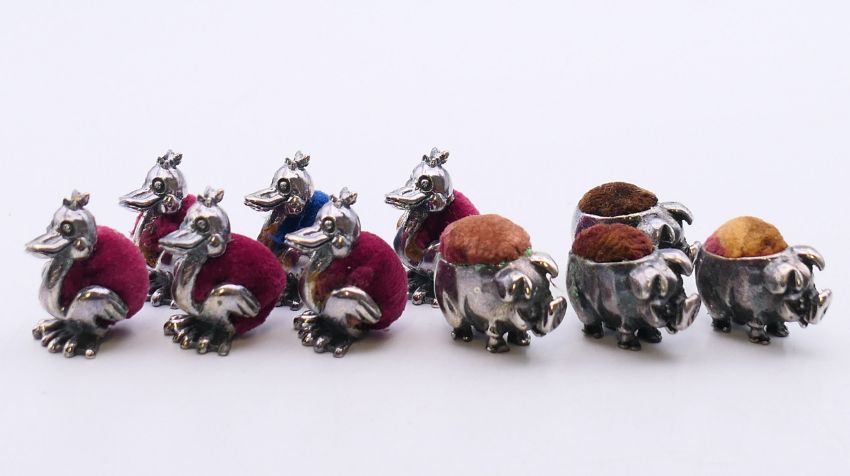 A quantity of pin cushions in the form of ducks and pigs and a pair of silver earrings. The later 1 cm high.