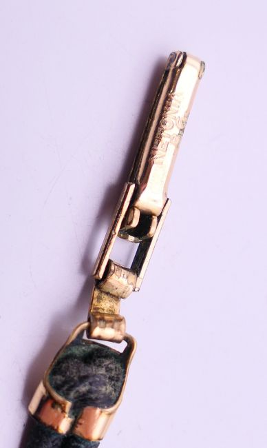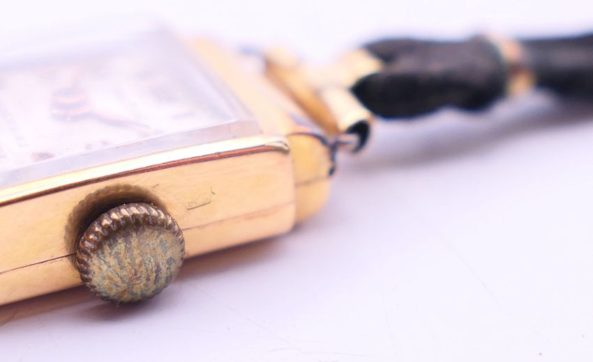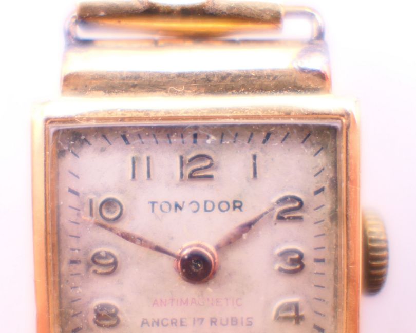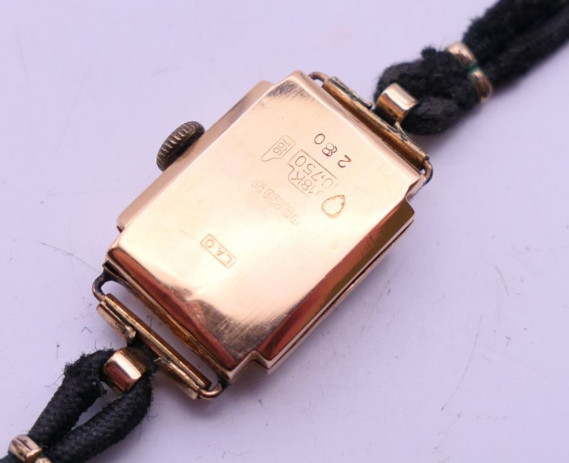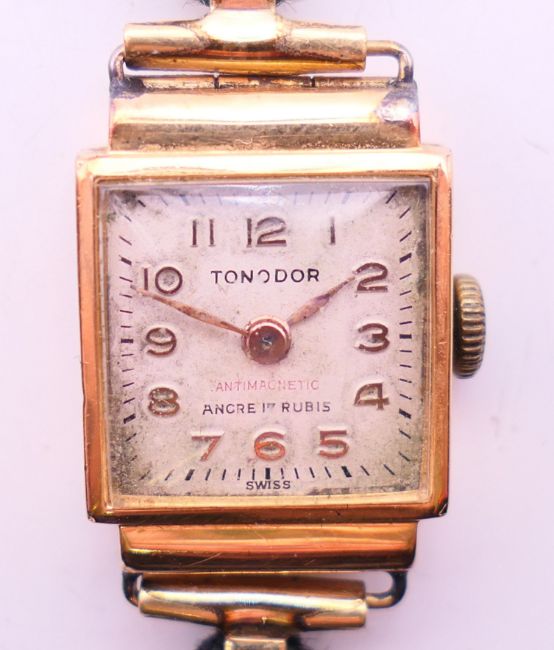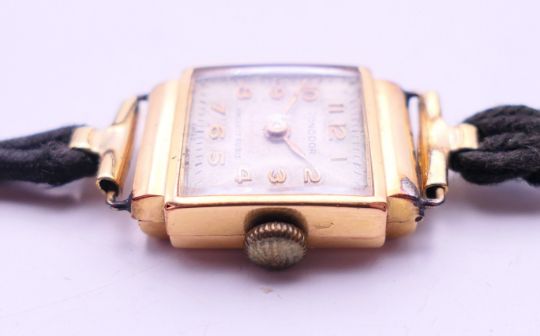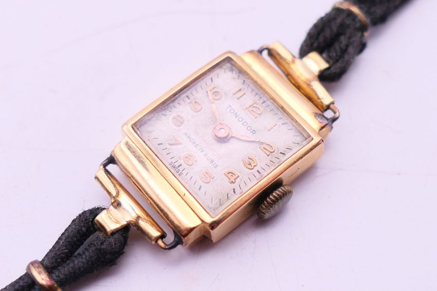 An 18 K gold cased Tonodor wristwatch with original fabric strap. 1.75 cm wide.9.6 grammes total weight.