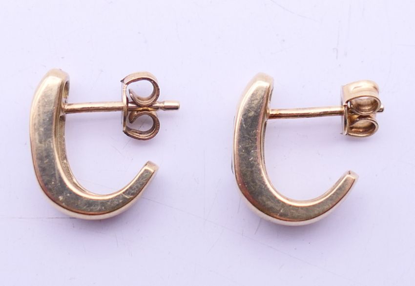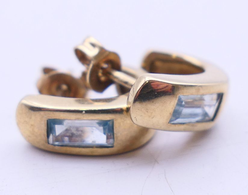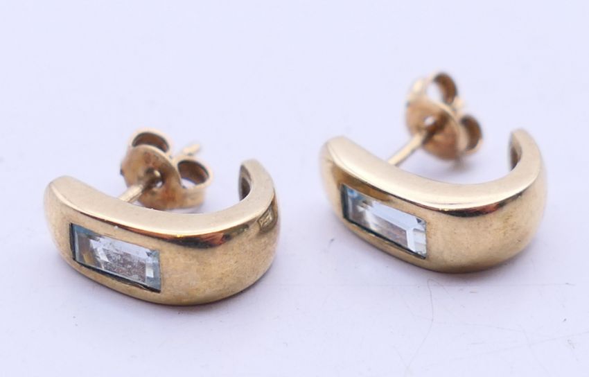 A pair of 9 ct gold and aquamarine earrings. 1 cm high.