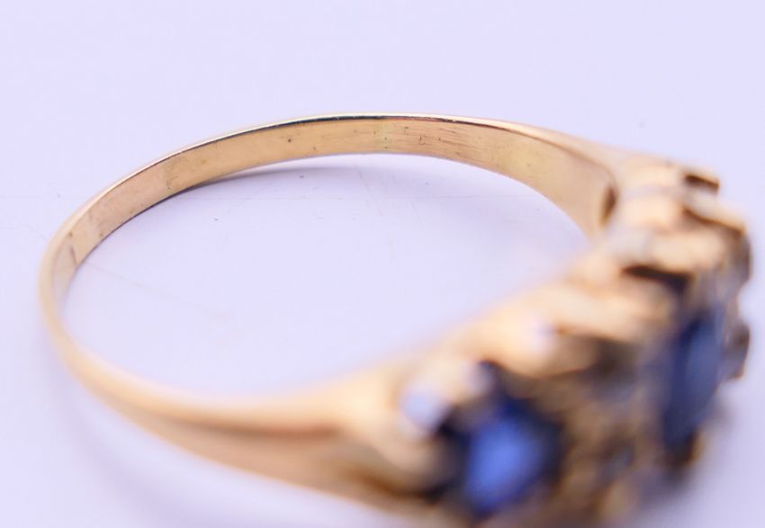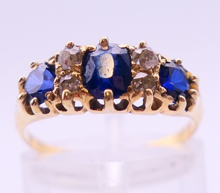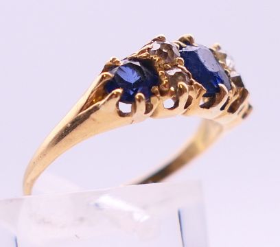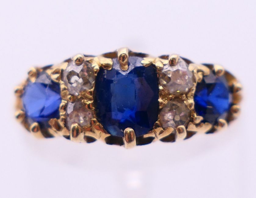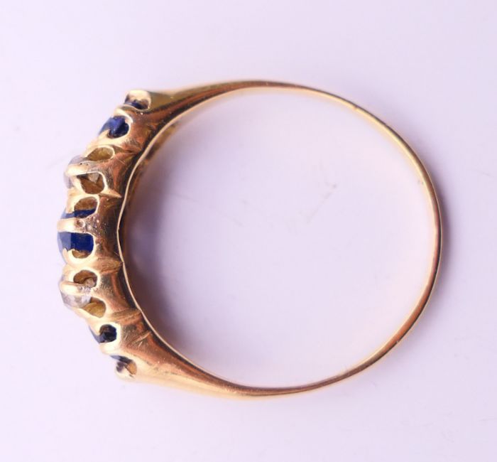 An 18 ct gold diamond and sapphire ring. 3.2 grammes total weight. Ring size N/O.