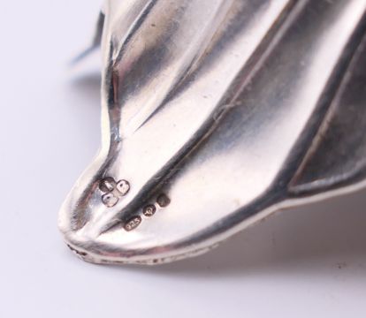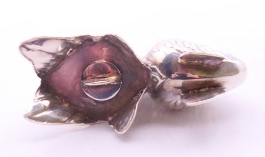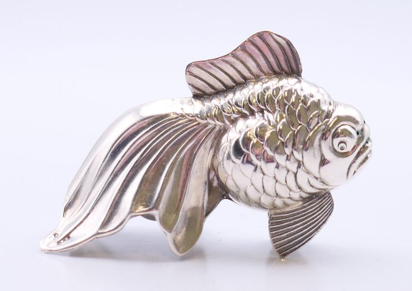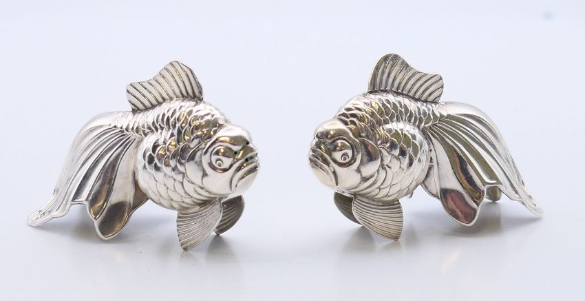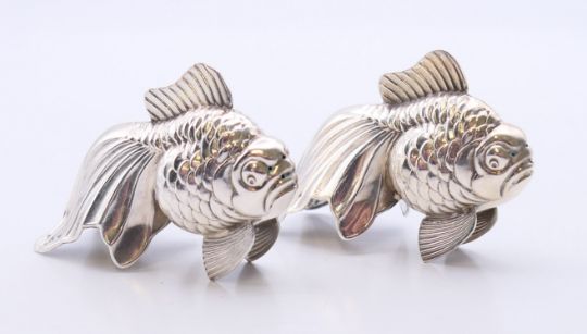 A pair of silver cruets in the form of goldfish, various silver marks. Each 6.5 cm wide, 5 cm high,