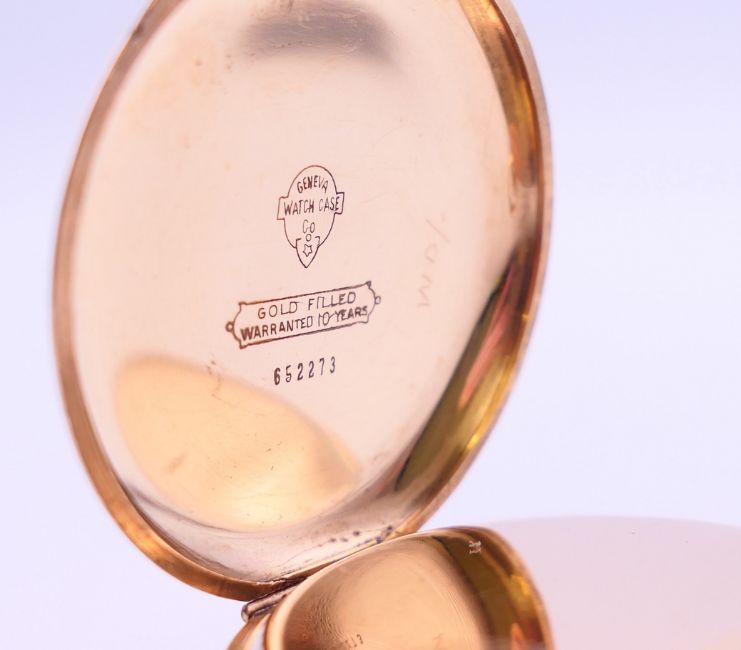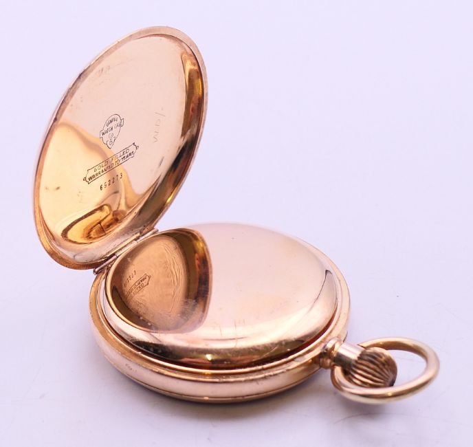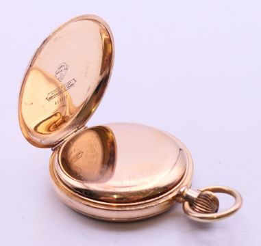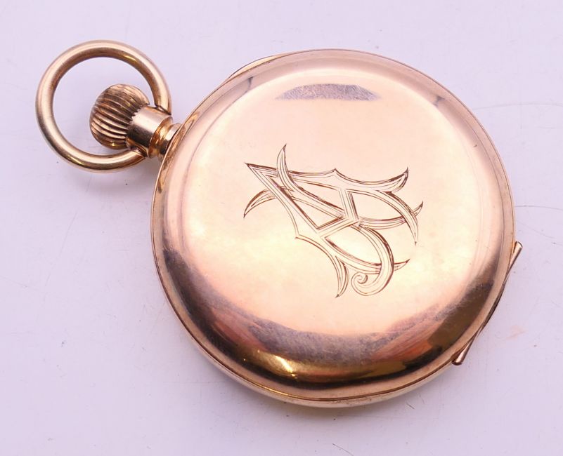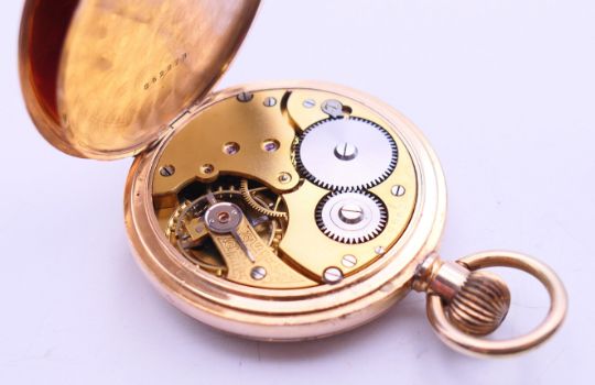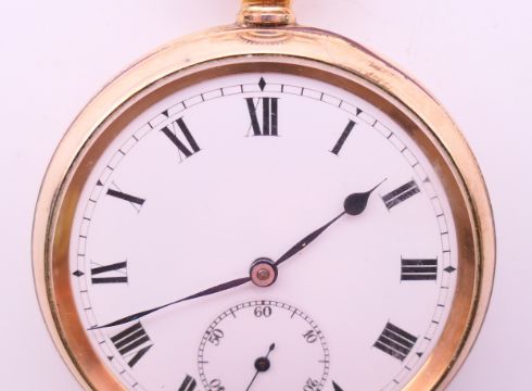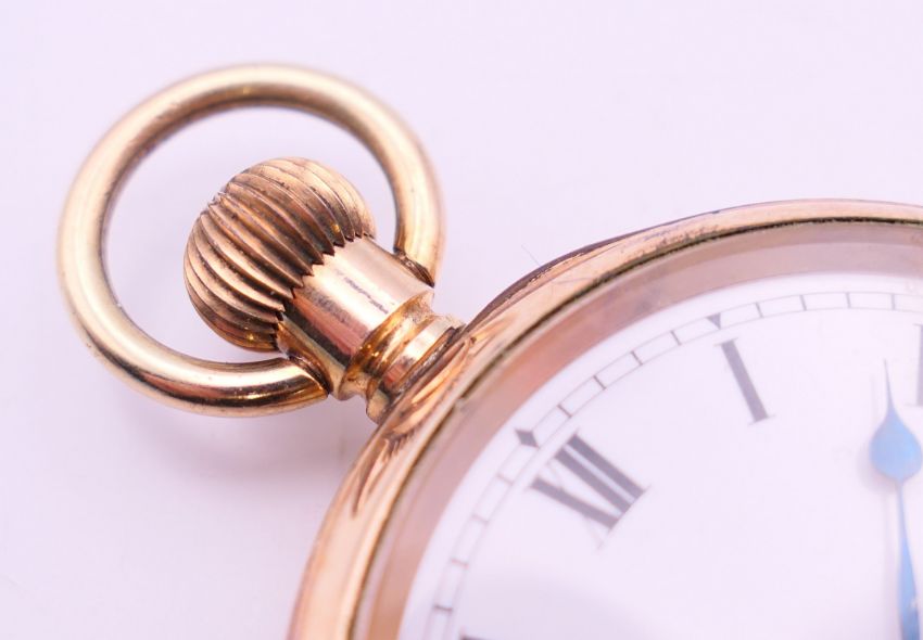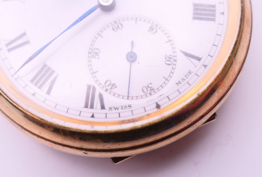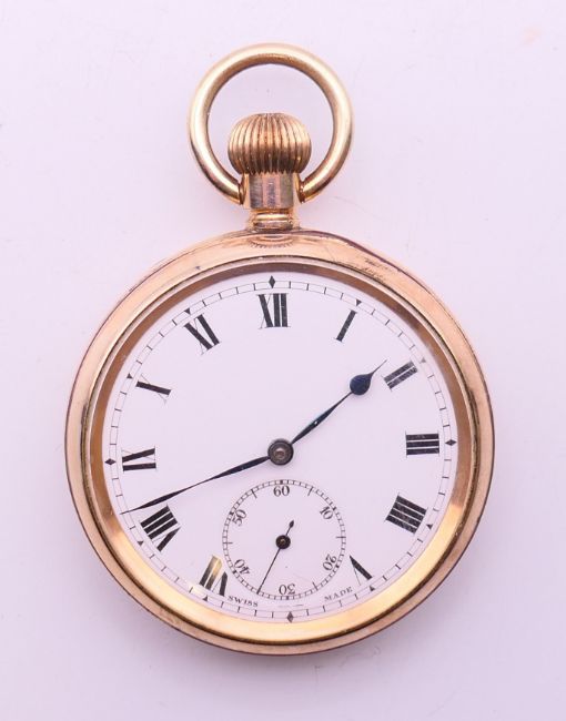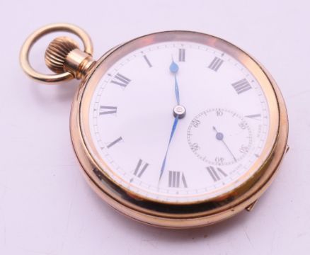 A gold plated pocket watch. 5 cm diameter.