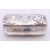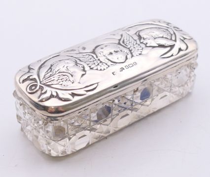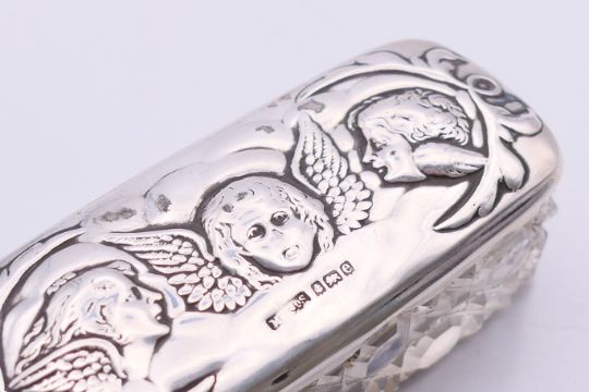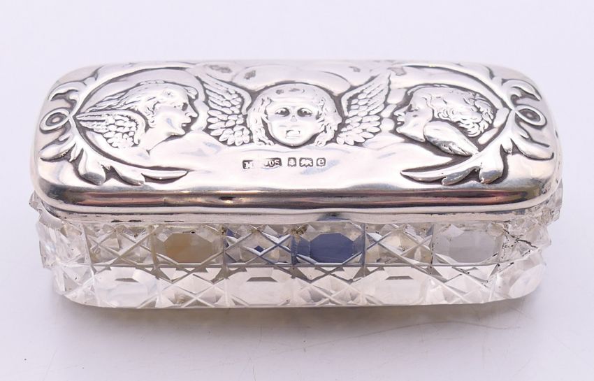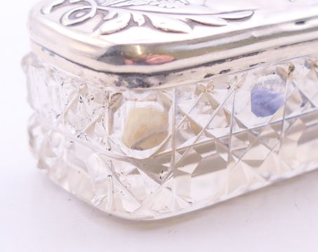 A silver-topped glass pin jar. 8.5 cm wide, 2.5 cm high.