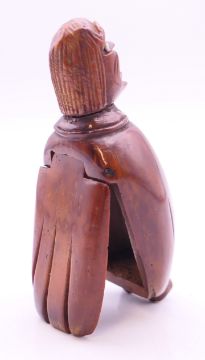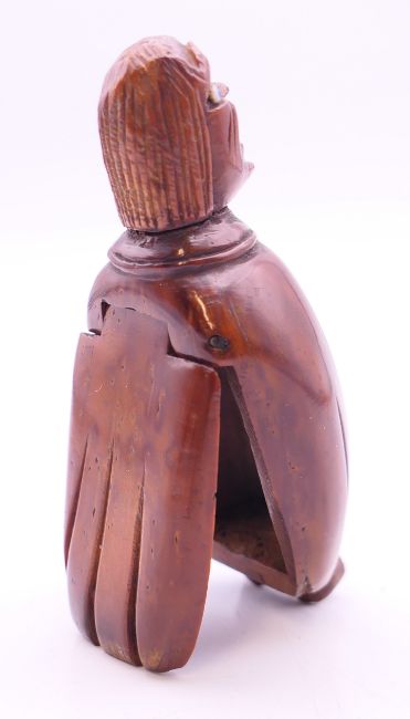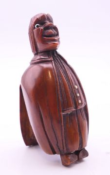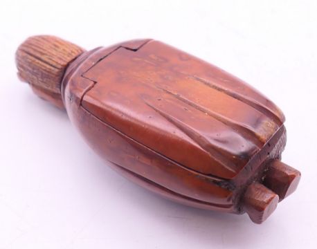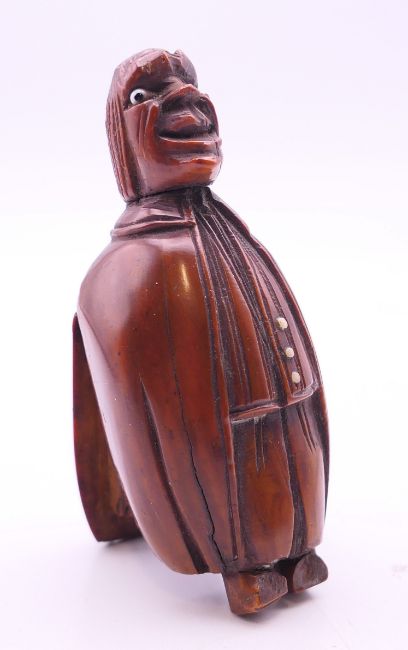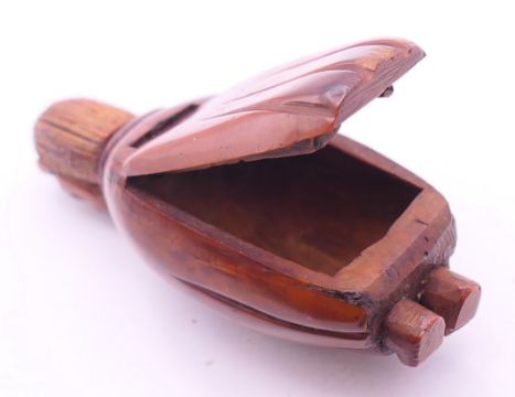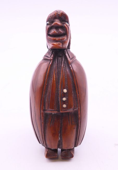 A carved coquilla nut figural snuff box. 8.5 cm high.