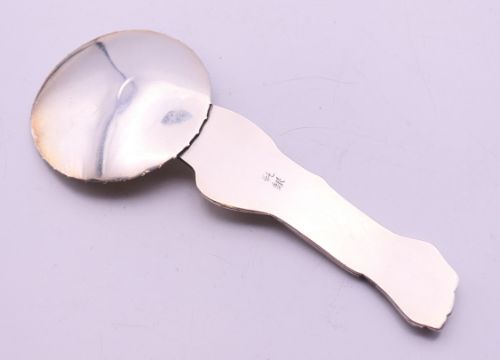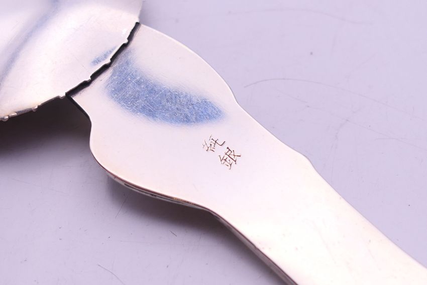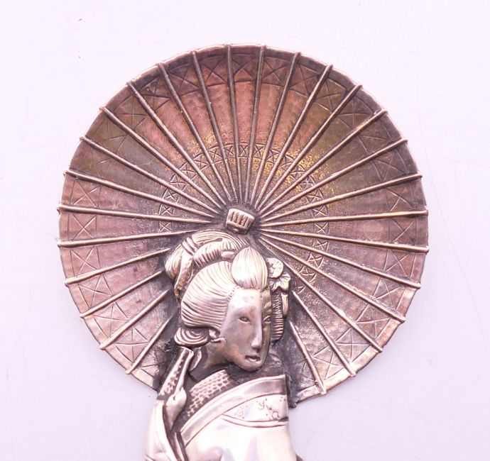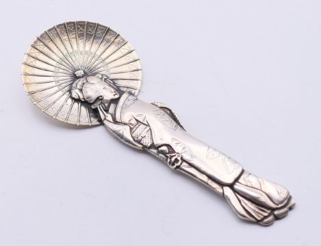 A Japanese silver spoon in the form of a Geisha with open parasol, circa 1900, signature to reverse. 13 cm high.