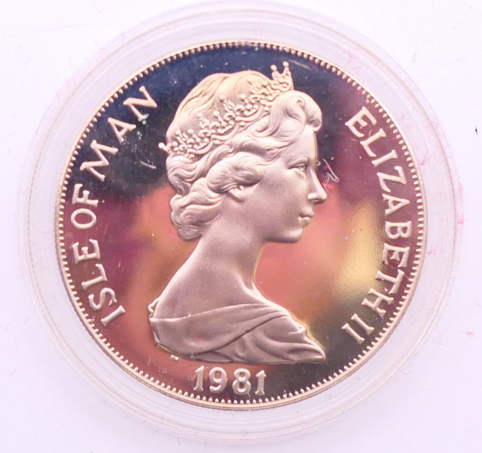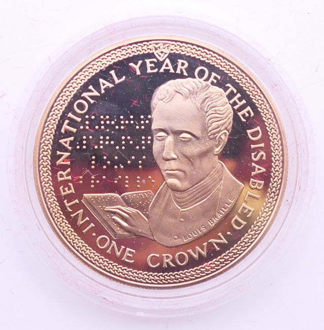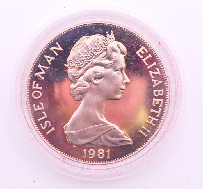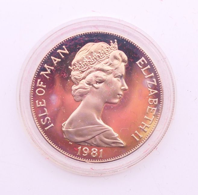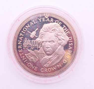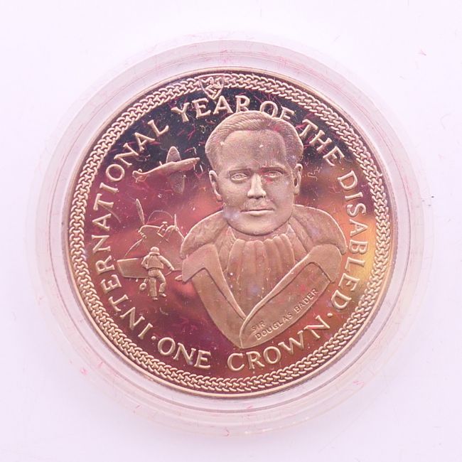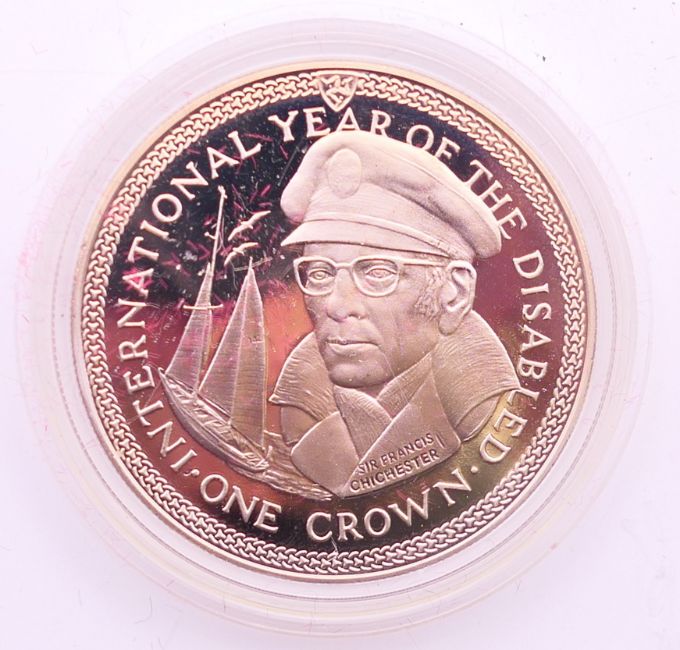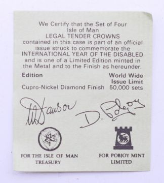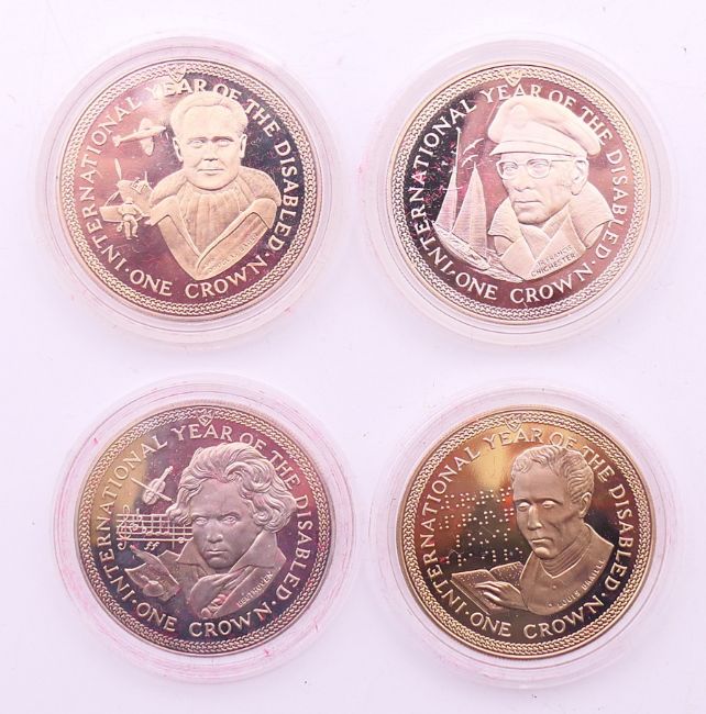 A boxed set of Isle of Man commemorative crown coins. The box 18.5 cm wide.